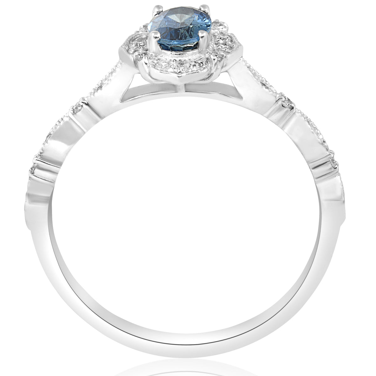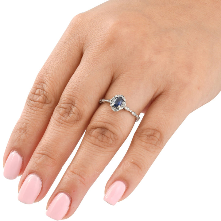 Solid 14k white gold setting. 6x4mm oval-cut genuine blue sapphire. 32 round-cut diamonds. Prong setting. Vintage-inspired milgrain detailing. Diamond clarity: I2-I3. Diamond color: I-J. High-polish finish.