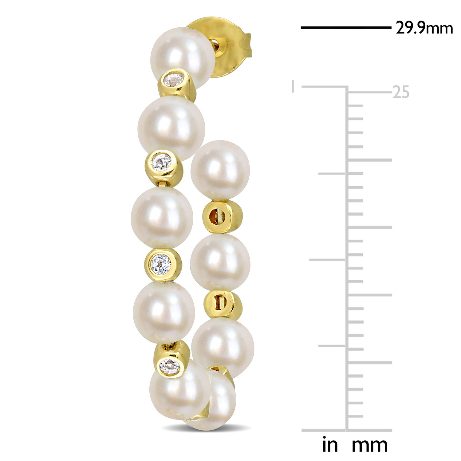 4.5-5 MM Freshwater Cultured Pearl and 1/2 CT TGW White Topaz Beaded Hoop Earrings in Yellow Plated Sterling Silver