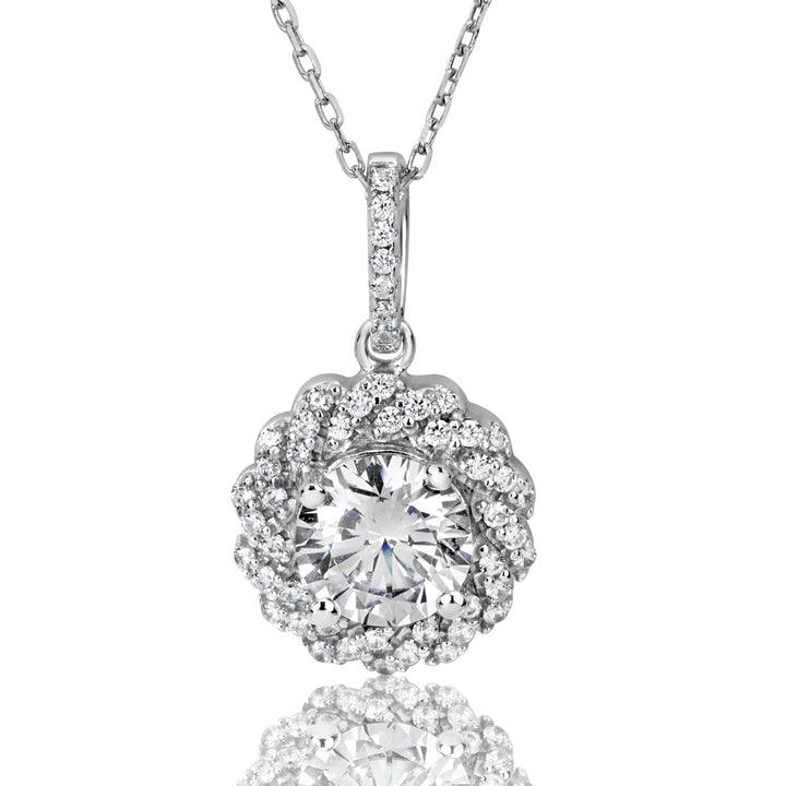 Handcrafted in sterling silver with white cubic zirconia stones. Pendant features a round-cut solitaire cubic zirconia with a pavé halo. Suspended from a sterling silver chain adorned with cubic zirconia accents. Secure clasp closure for effortless wear.