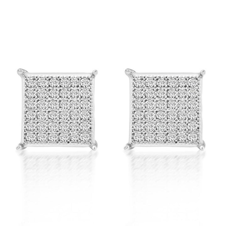 Handcrafted in 14k white gold, these earrings feature 72 round natural diamonds with a total diamond weight of 1/3 carat. The diamonds are H-I in color with I2-I3 clarity. Each stud is secured with a screw-back closure for enhanced security.