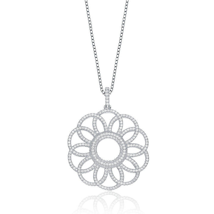Crafted in .925 sterling silver, featuring white round-cut cubic zirconias in a floral pendant design. Suspended from a fine chain, secured with a spring ring clasp.