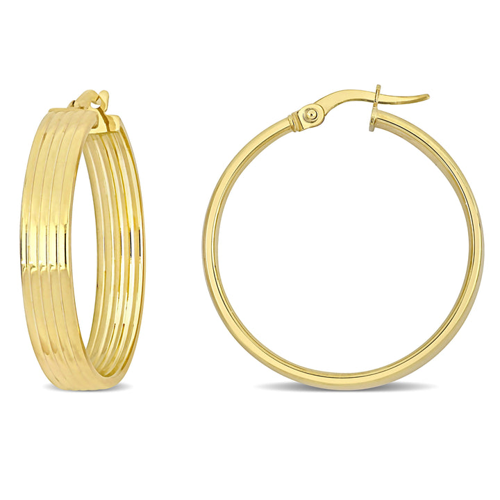 These 29 MM 5-Row Hoop Earrings by Mimi & Max elevate a classic hoop silhouette with bold texture and dimension. Crafted in lustrous yellow gold, they feature five finely polished rows that create a structured, layered effect. Their round shape and gleaming finish make them a statement piece for any occasion, while the clip-in closures ensure secure and comfortable wear.