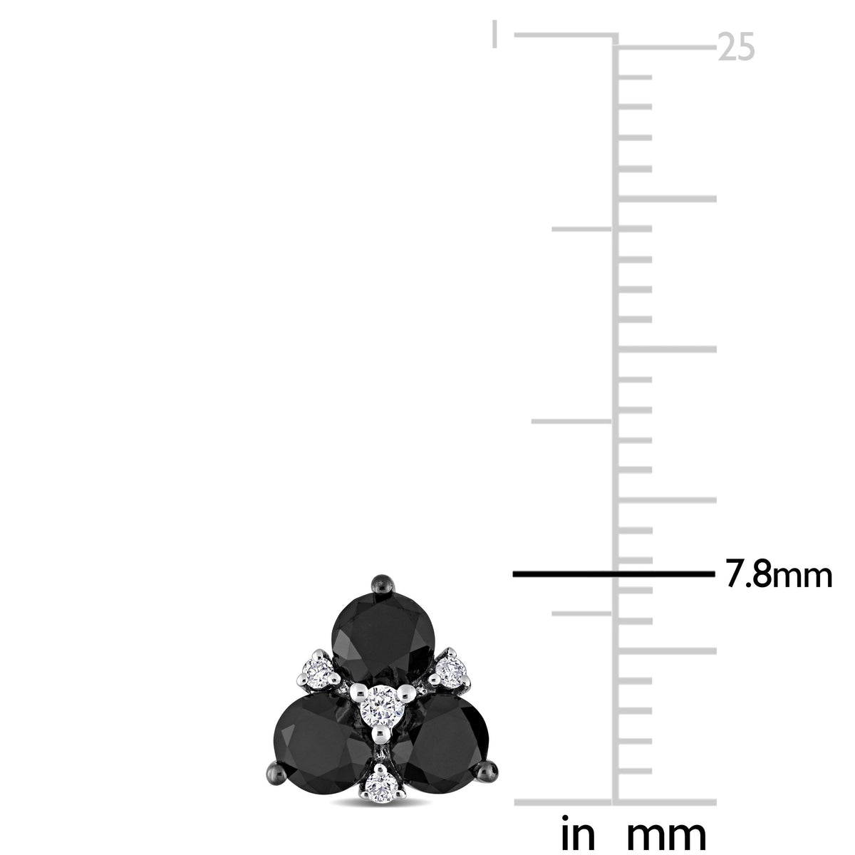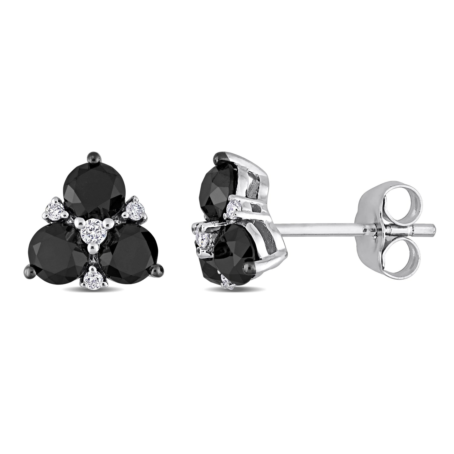 Crafted in 10K white gold. Features six round-cut black diamonds and eight round-cut white diamonds in a clustered design. Secured with butterfly backs.