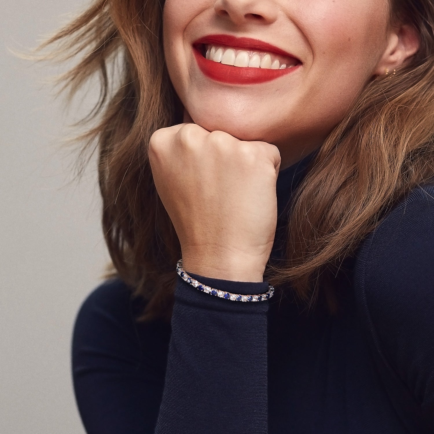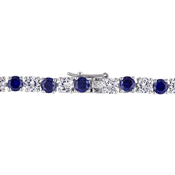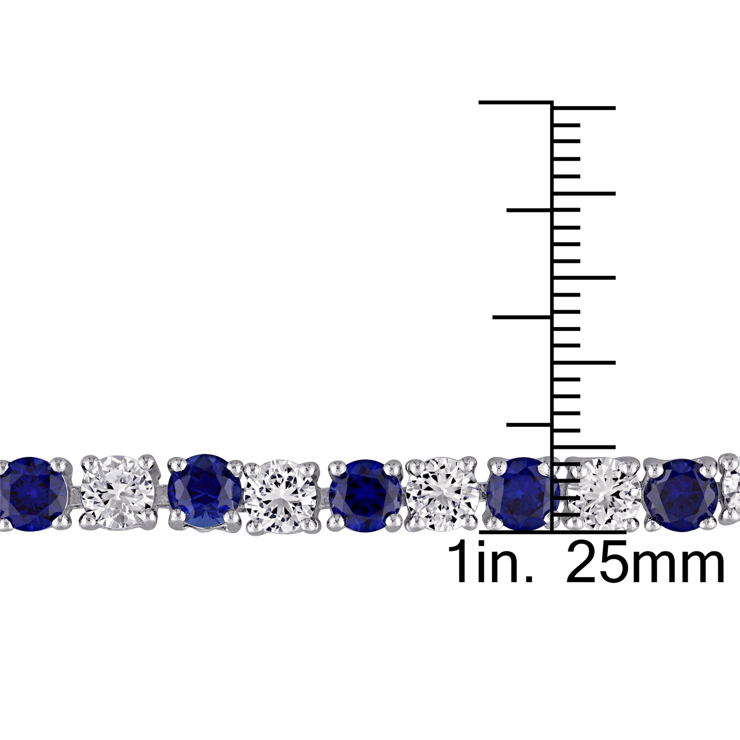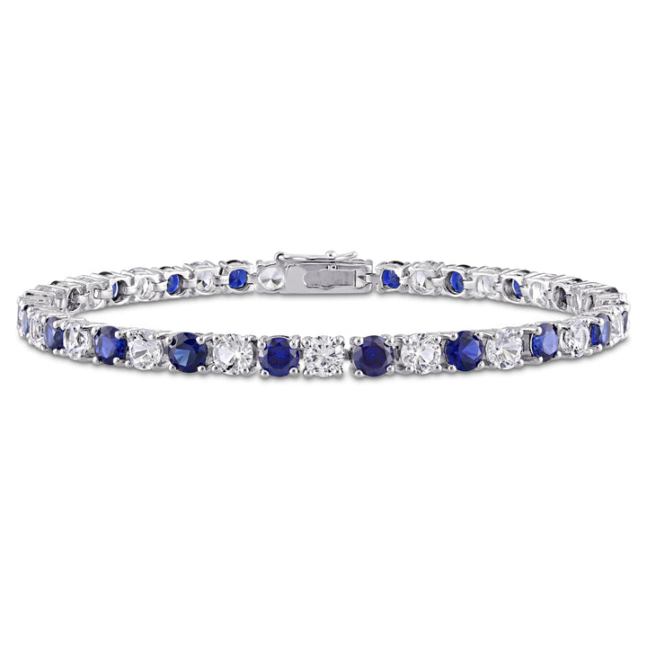 Crafted in sterling silver. Features 21 round-cut prong-set created blue sapphires (4 mm) and 21 round-cut prong-set created white sapphires. Total gemstone weight: 14 1/4 carats. Bracelet length: 7.25 inches. Secured with a pressure tongue clasp.