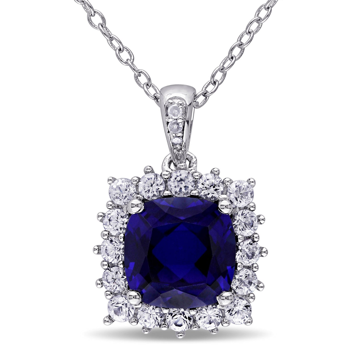 Crafted in sterling silver. Features a round-cut (8 mm) created blue sapphire. Accented with round-cut (2 mm) created white sapphires and three round-cut pave-set diamonds (G-H, I2-I3). Suspended from an 18-inch cable chain with a spring ring clasp. Total gemstone weight: 3 3/5 carats.
