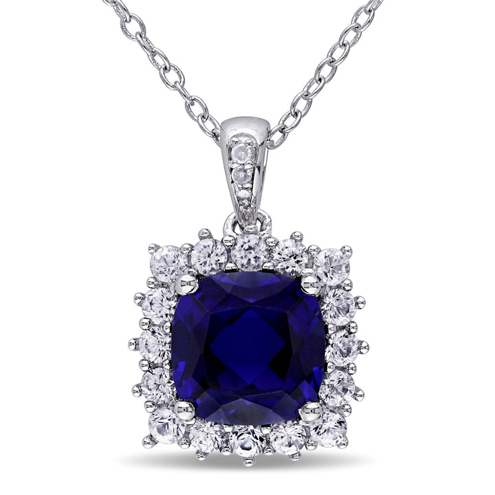 3 3/5 CT TGW Created Blue and Created White Sapphire and Diamond Halo Pendant with Chain in Sterling Silver