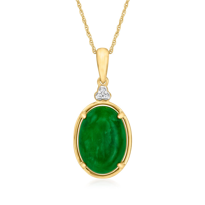 Crafted in 10K yellow gold. Features a 14x10mm oval cabochon natural jade with three round natural diamond accents (0.01 total carat weight, I-J color, I2 clarity). Set in white rhodium. Includes an 18-inch, 0.75mm rope chain with a spring ring clasp.