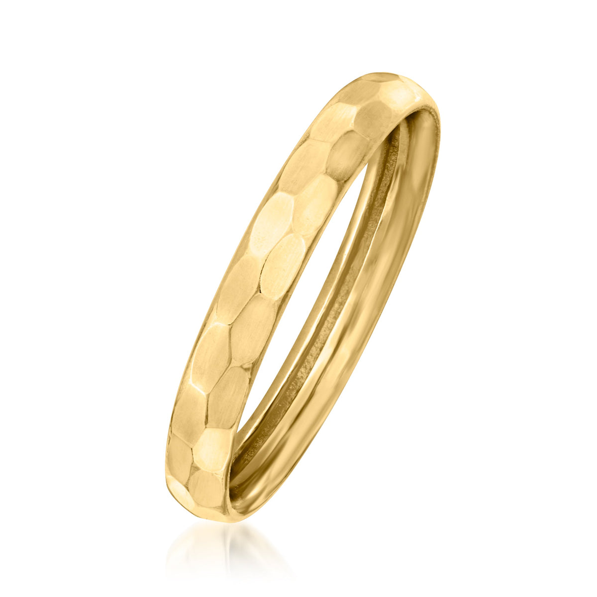 Handcrafted in 10kt yellow gold with a hammered finish. Measures 1/8 inch in width. Weighs approximately 0.7 grams. Available in size 5.