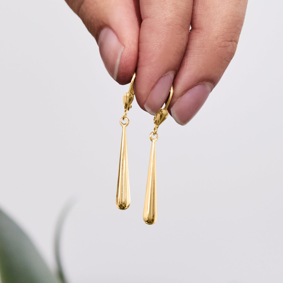 Handcrafted in 10kt yellow gold with a polished finish. Hanging length measures 1 5/8 inches; width is 3/16 inch. Weighs approximately 1.7 grams. Secured with lever backings.