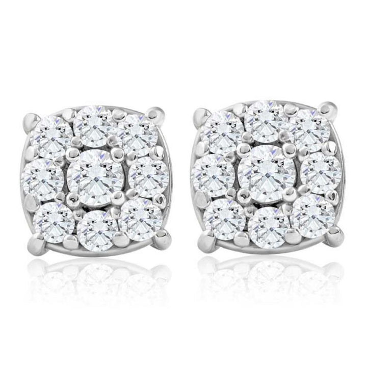 Crafted in 10kt white gold. Set with 1.00 Ct. T.W. round diamonds (H-I color, I2-I3 clarity, natural, untreated). Secured with push-back closures.