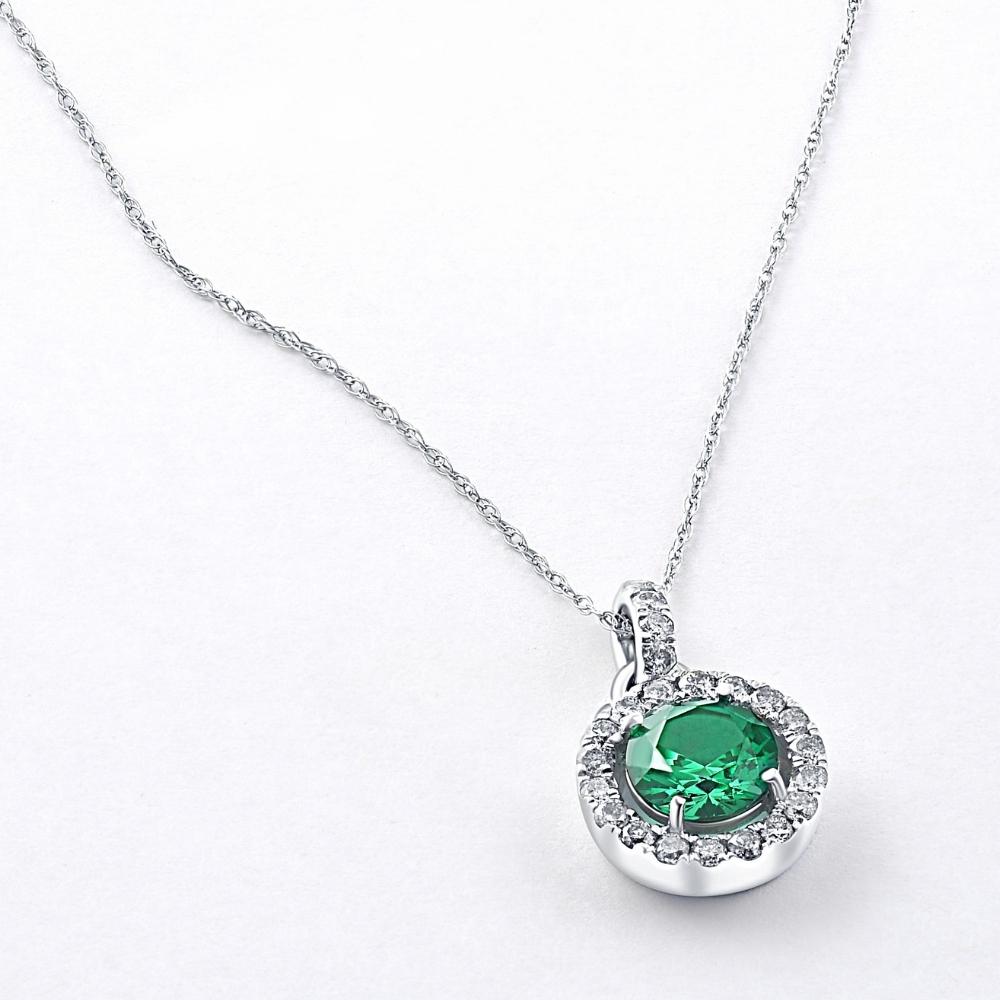 Crafted in 10kt white gold. Set with 6.5mm oval emerald (natural) and 22 round brilliant diamonds (G-H color, I2-I3 clarity, natural, untreated). Includes an 18 in. clasp-lock chain.