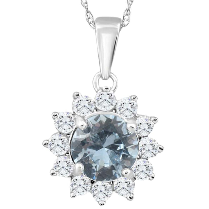 Crafted in 10k white gold. Set with a 6mm round aquamarine center stone (natural) and 12 round brilliant diamonds (G-H color, I2-I3 clarity, natural, untreated). Includes an 18 in. clasp-lock chain.