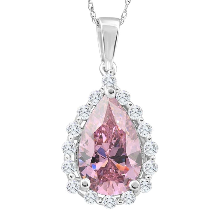 Handcrafted in solid 10k white gold, featuring a 9x13mm pear-shaped pink topaz as the centerpiece, surrounded by 22 round brilliant-cut accent diamonds. Diamonds are G-H color, I2-I3 clarity. Suspended from an 18-inch 10k white gold clasp lock chain for secure wear.