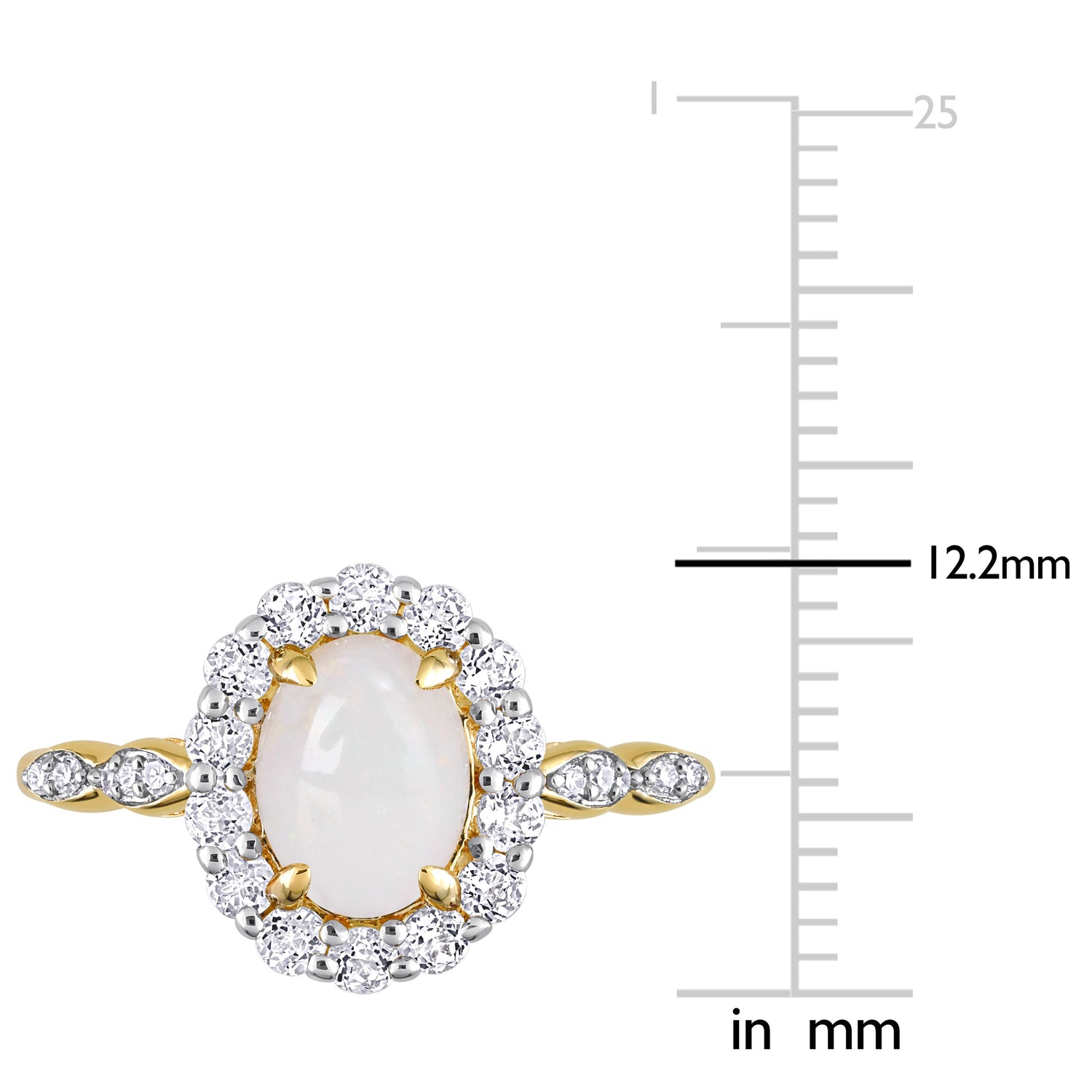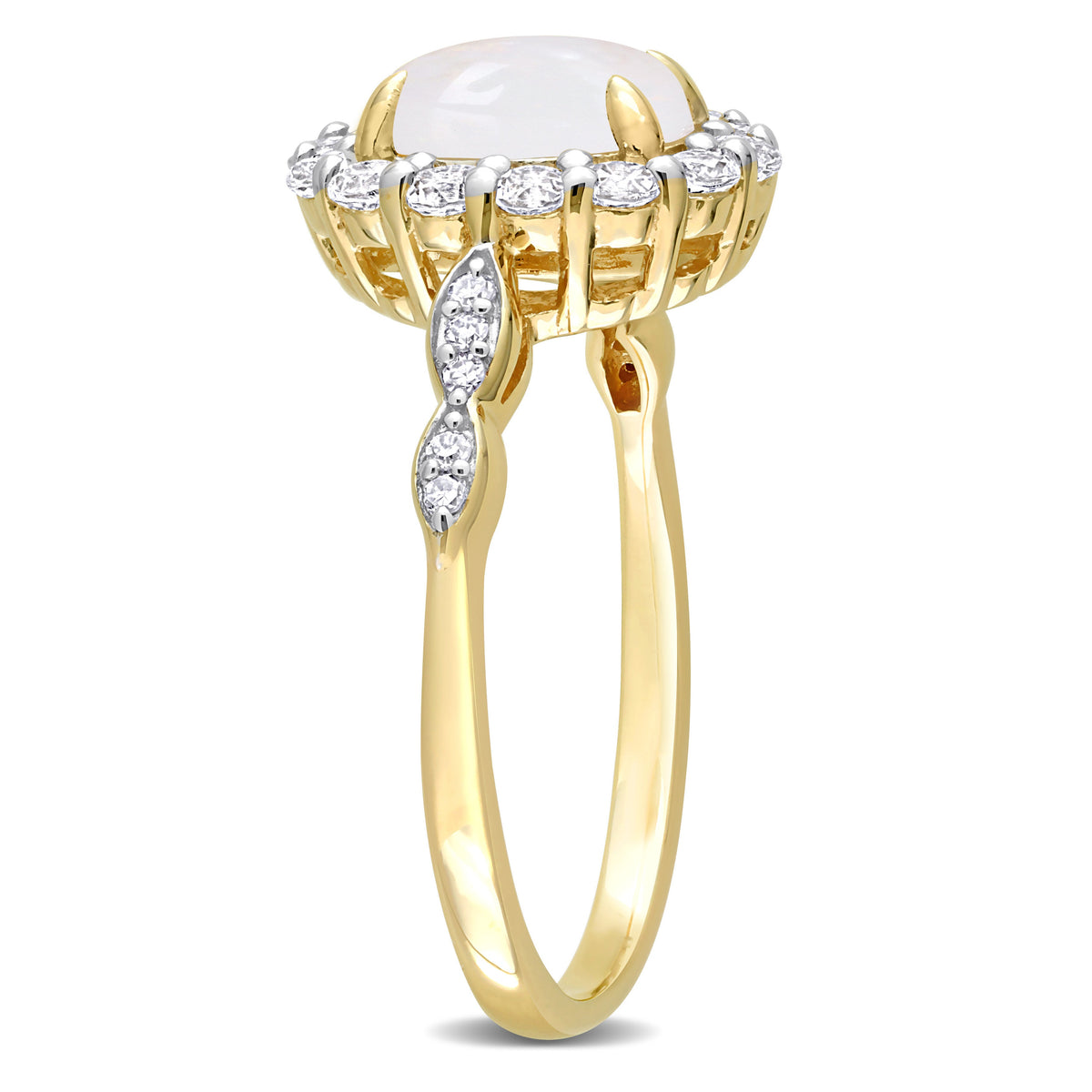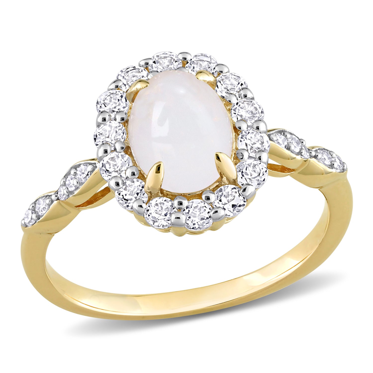 Crafted in 14k yellow gold, featuring an 8x6mm oval-cut opal, 14 created white topaz stones (2x2mm) in a halo setting, and 10 natural round-cut diamonds (G-H color, I1-I2 clarity, pave-set) along the band. Polished to a brilliant shine.