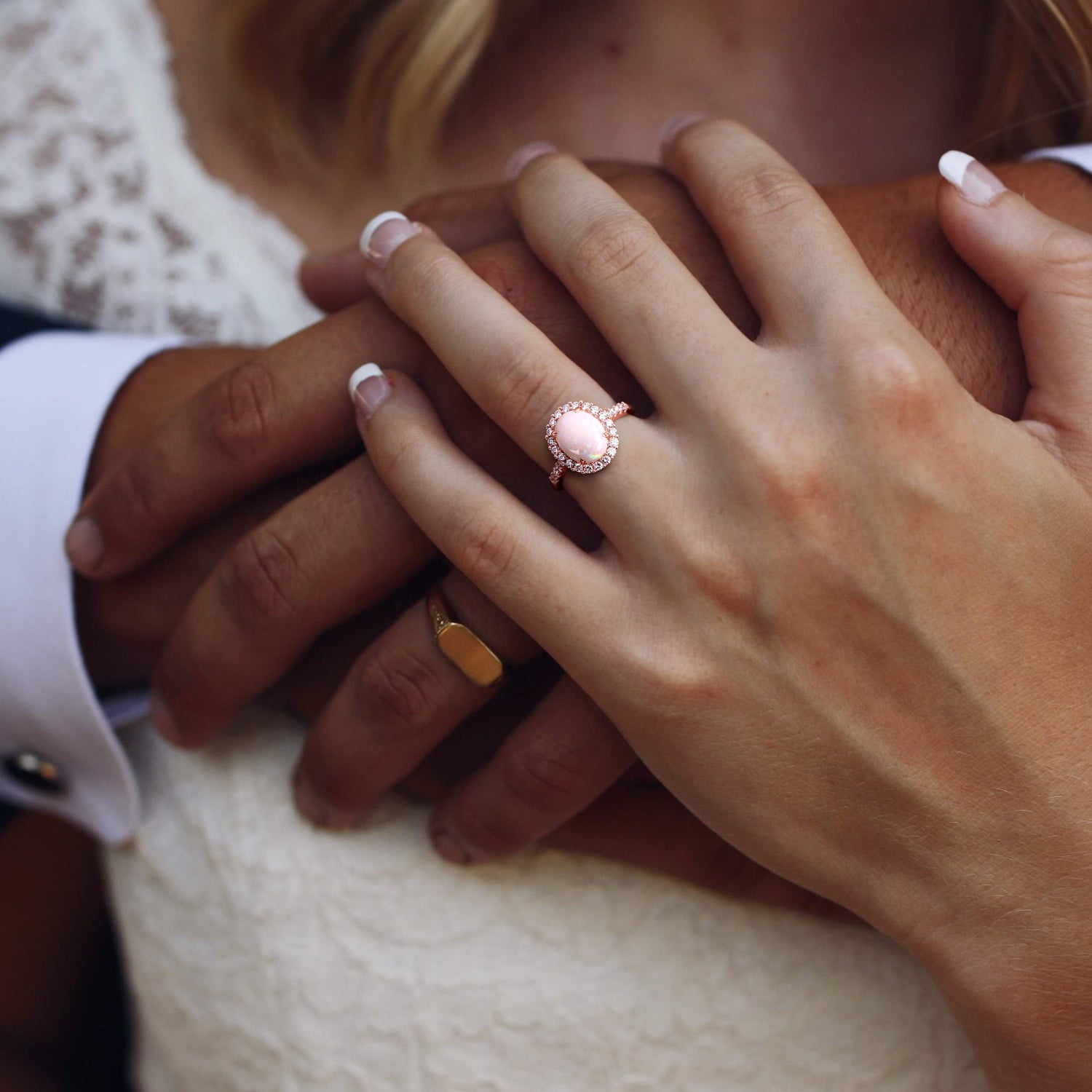 This 1 5/8 CT TGW Opal and 2/5 CT TW Diamond Halo Ring by Mimi & Max is a striking cocktail ring that radiates sophistication. At its heart lies a mesmerizing oval-cut opal, its luminous hues highlighted by a dazzling halo of round-cut diamonds. Set in warm rose gold, this ring blends vintage charm with contemporary elegance, making it the perfect statement piece for any jewelry lover.