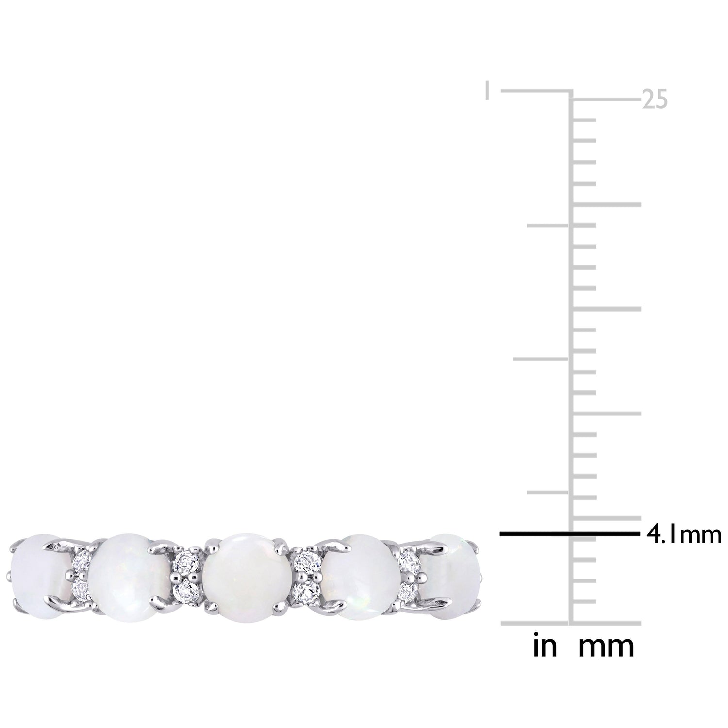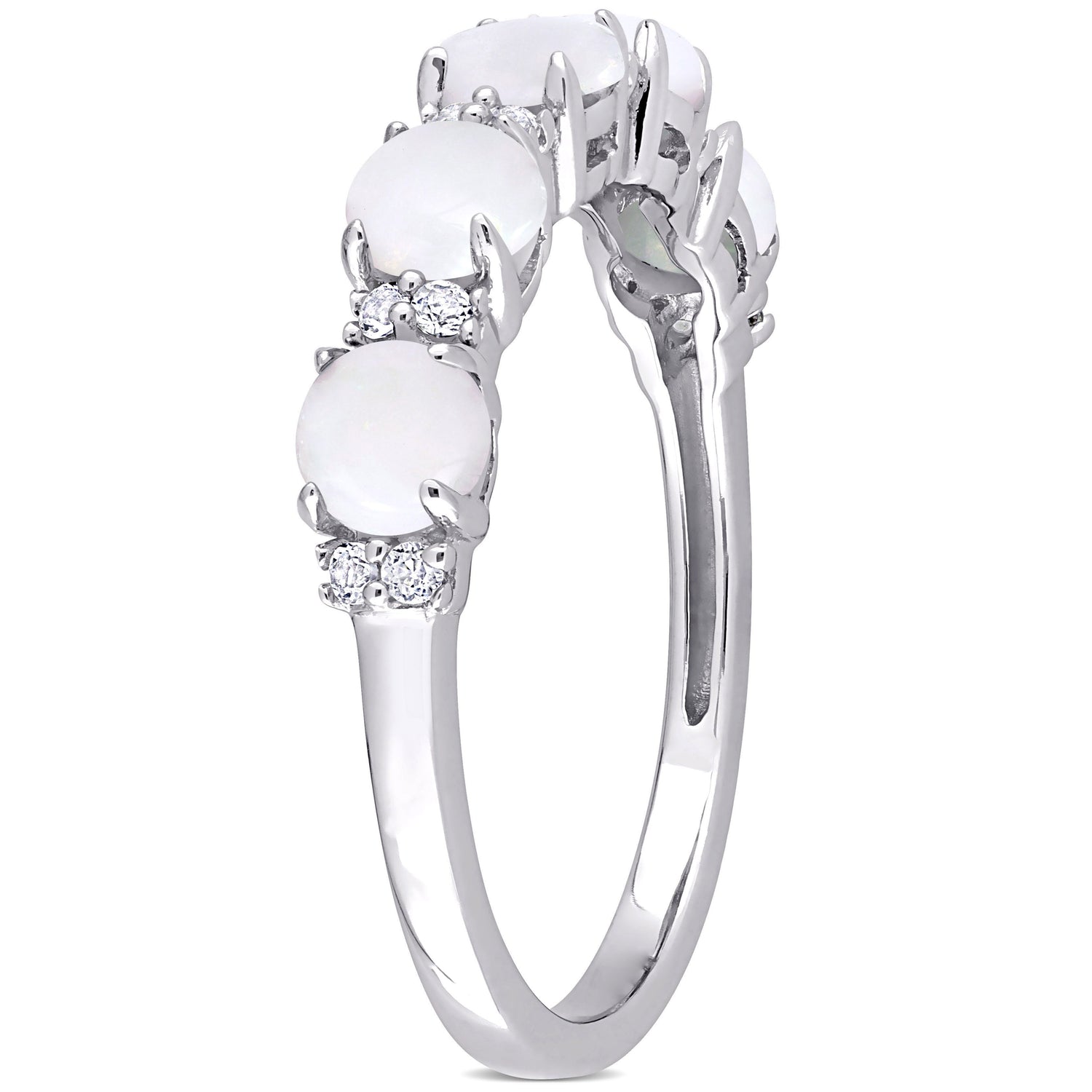 Crafted in sterling silver, featuring five round-cut opal gemstones (4x4mm, prong-set), flanked by 12 round-cut white topaz stones (prong-set) along the band. Finished with a high polish for a refined look.