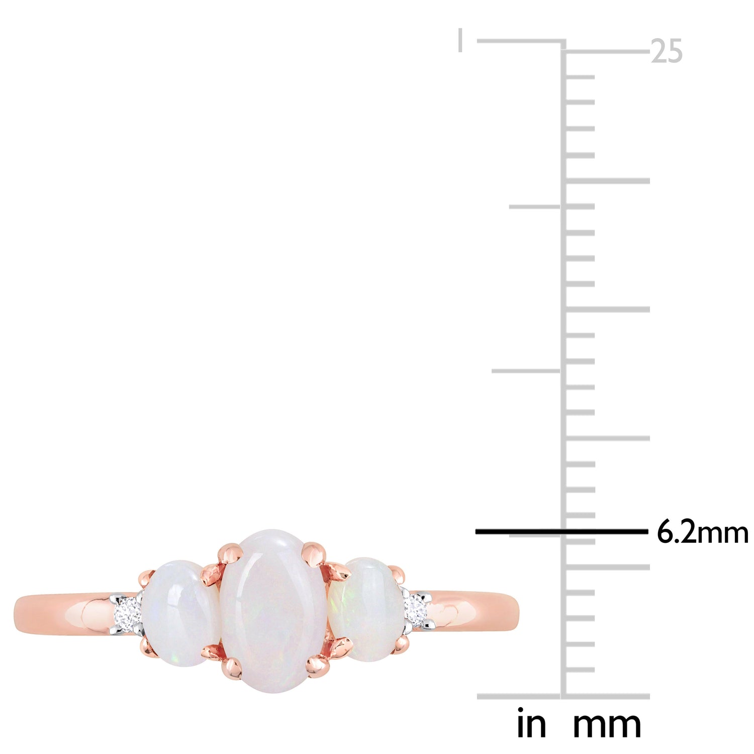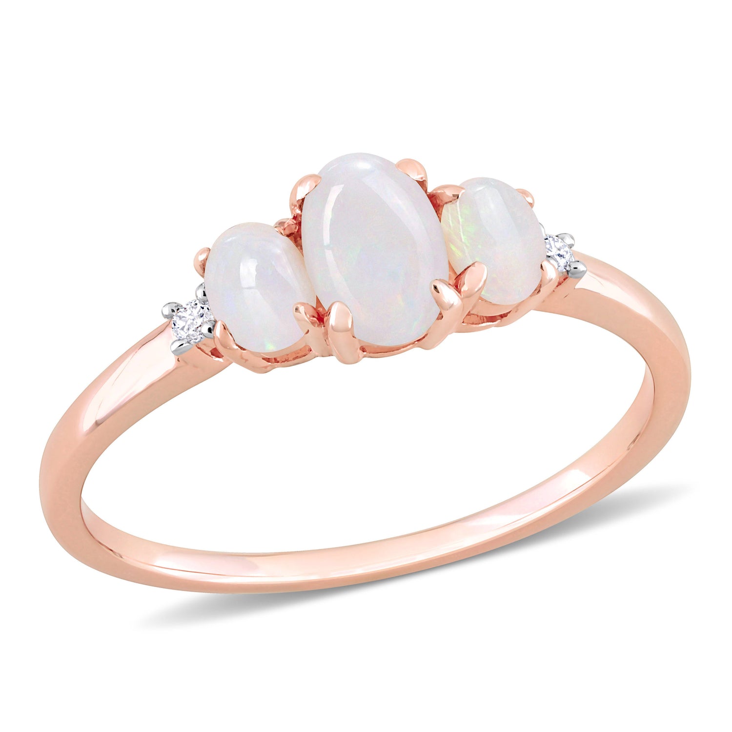 Crafted in 10k rose gold, featuring three oval-cut opal gemstones (prong-set), accented by two round-cut diamonds (G-H-I color, I2-I3 clarity, prong-set). Finished with a high-polish shine.