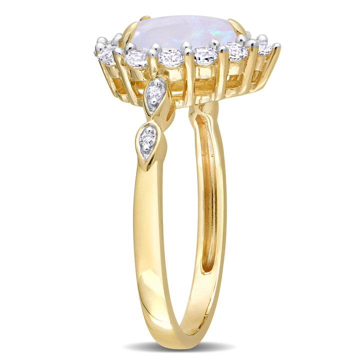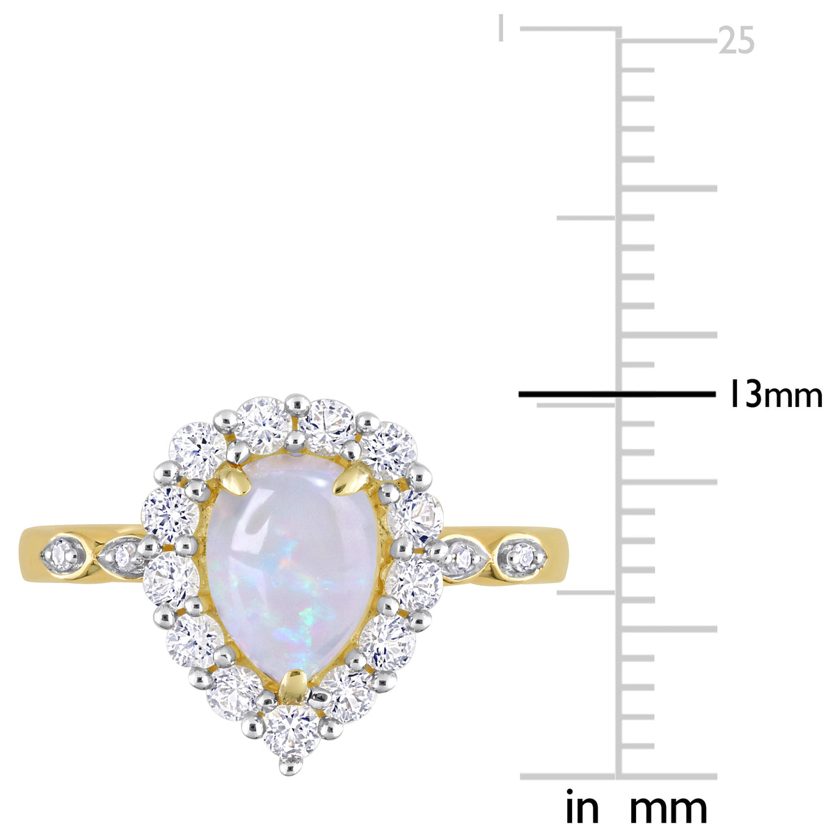 1 1/2 CT TGW Pear Shape Opal and Created White Sapphire and Diamond Accent Halo Ring in 10K Yellow Gold