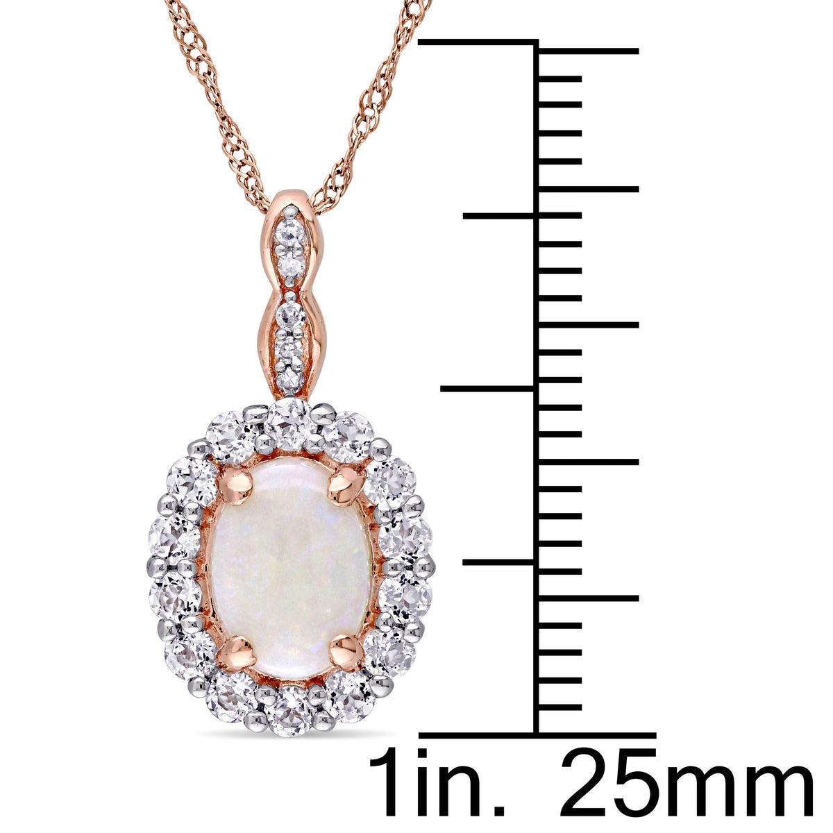 Crafted in 14k rose gold, featuring an 8x6mm oval-cut opal (prong-set, center stone), encircled by 14 round-cut white topaz gemstones (2x2mm, prong-set, halo design), and five round-cut diamonds (G-H color, I1-I2 clarity, pave-set in the bale). Suspended from a 17-inch chain with a spring-ring clasp.