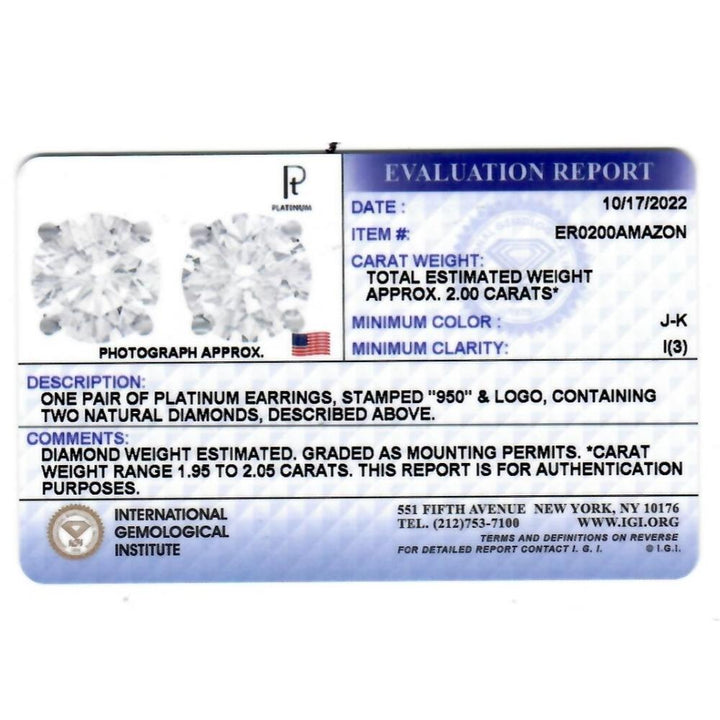 Crafted in solid platinum, these stud earrings feature 2.00 total carat weight of natural diamonds with a round brilliant cut. The diamonds are secured in prong settings and fastened with screw-back closures. Includes an IGI certificate card for authenticity.