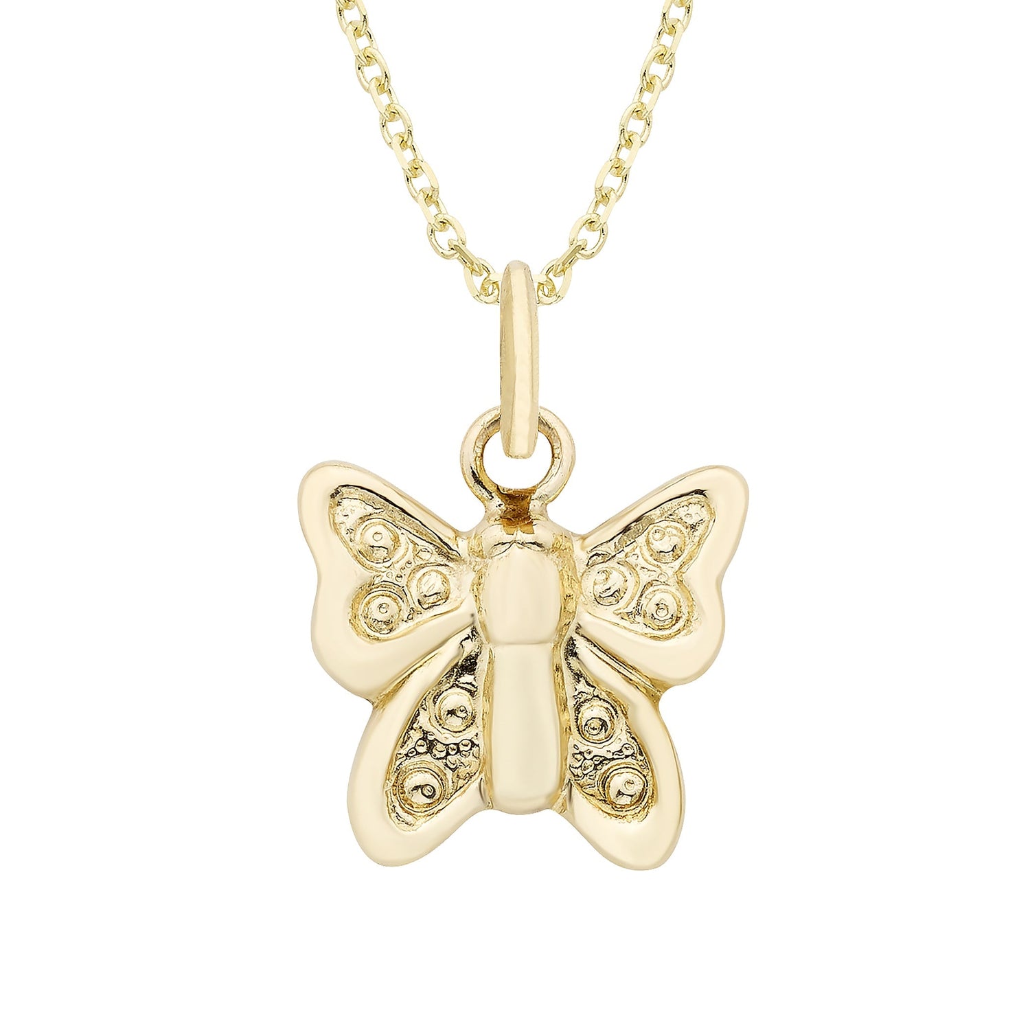 This 14K Gold Butterfly Charm Necklace by A&M embodies grace and transformation. The delicate butterfly pendant, rendered in polished gold, exudes elegance and charm. Suspended from a fine cable chain, this piece is a timeless symbol of beauty and renewal. Whether worn as a personal talisman or gifted to a loved one, this necklace adds a touch of sophistication to any jewelry collection.