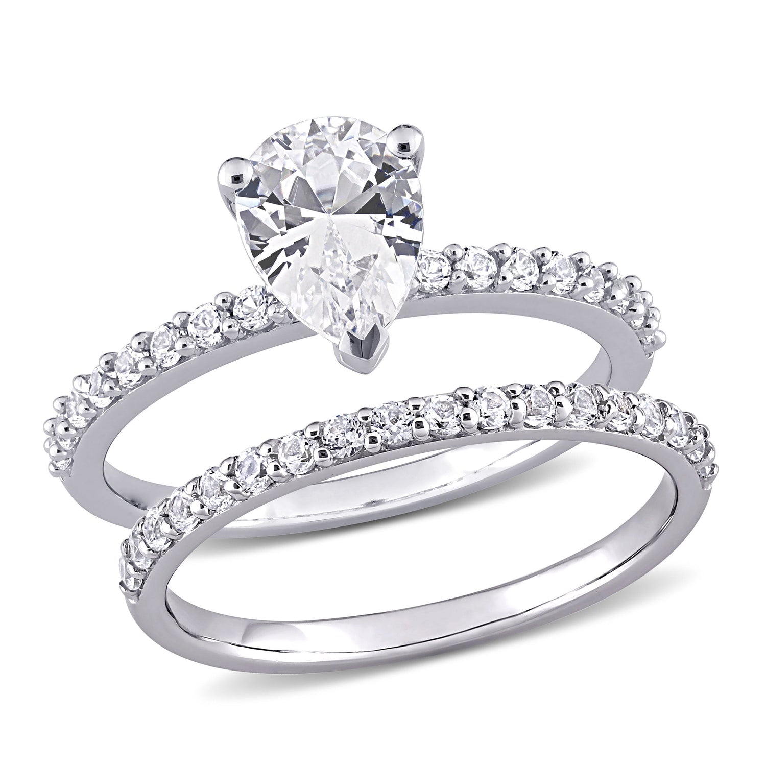 Crafted in 10K white gold, this engagement ring features a pear-cut created white sapphire (2 1/2 ct. t.w.) in a 3-prong setting, with 16 round-cut created sapphires on the band. The matching wedding band features 18 round-cut created white sapphires. Both rings are polished to a high shine. Packaged in a fine jewelry presentation box.