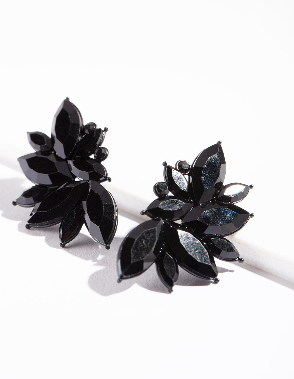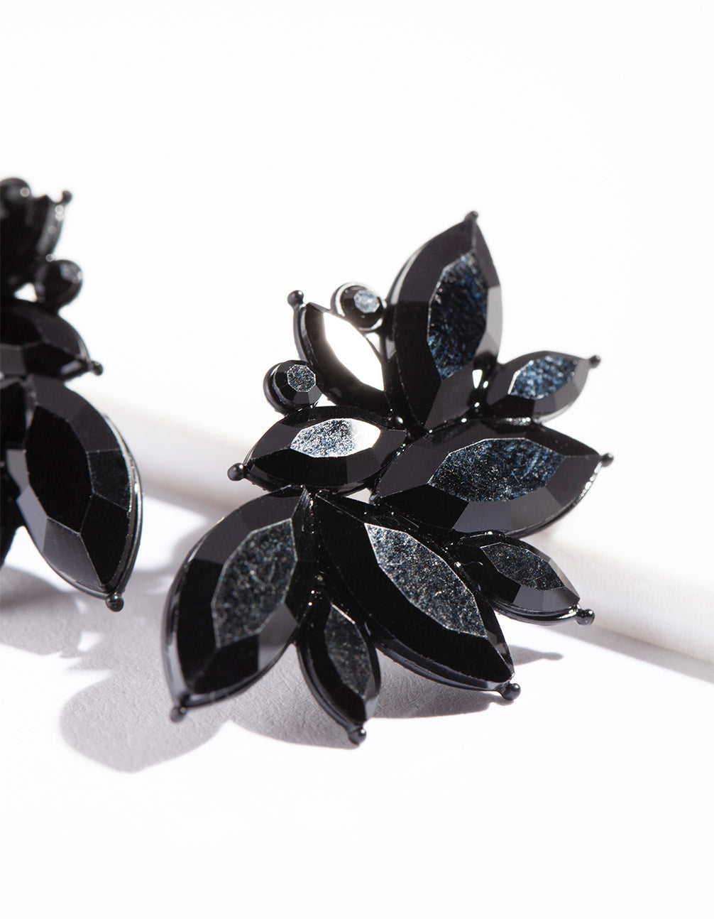 Crafted in metal with black navette-shaped gems. Earring size: 40mm (L) x 24mm (W). Weight: 6.21g (one earring).