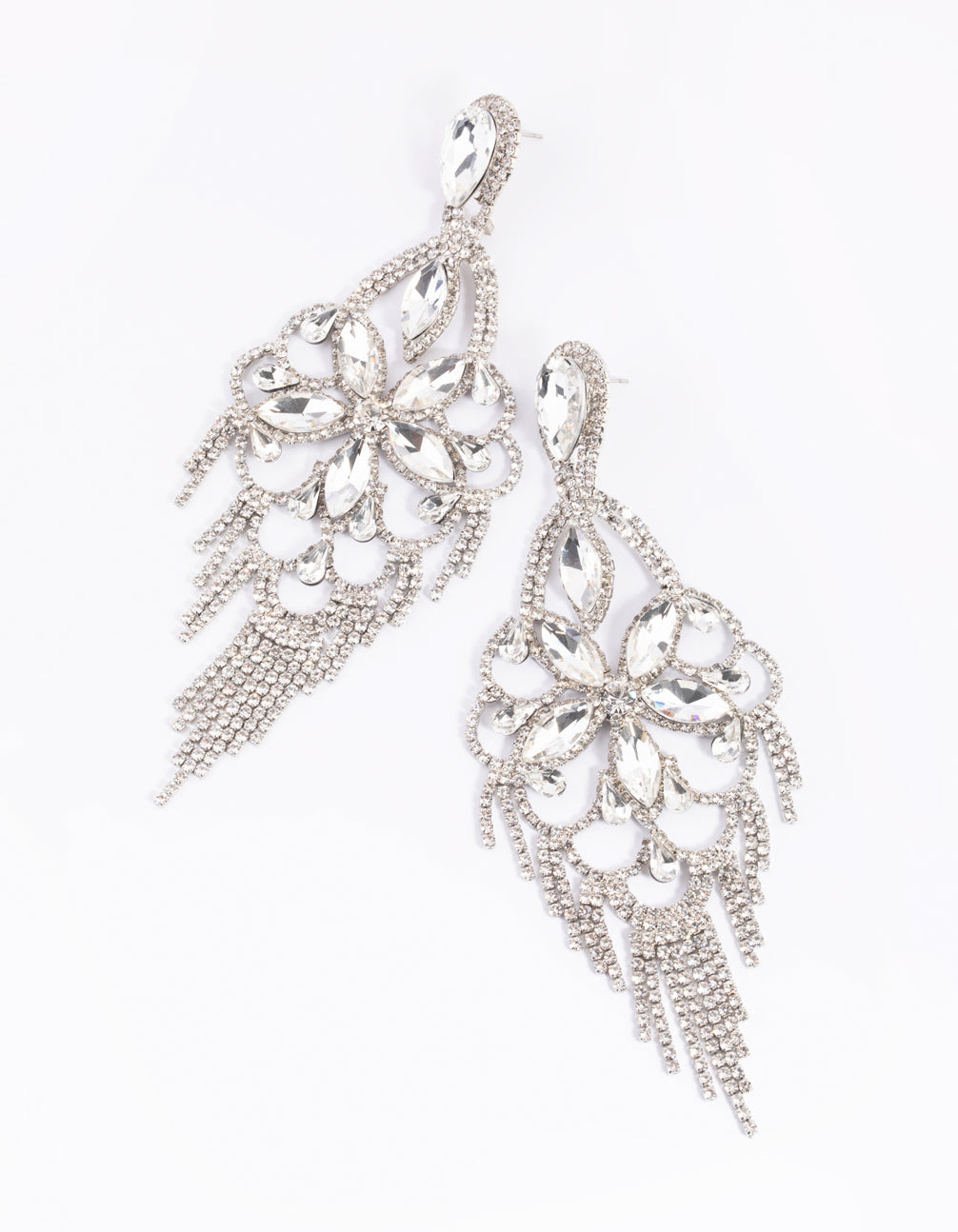 Crafted in rhodium-plated metal with diamante stones. Drop length: 2 inches.