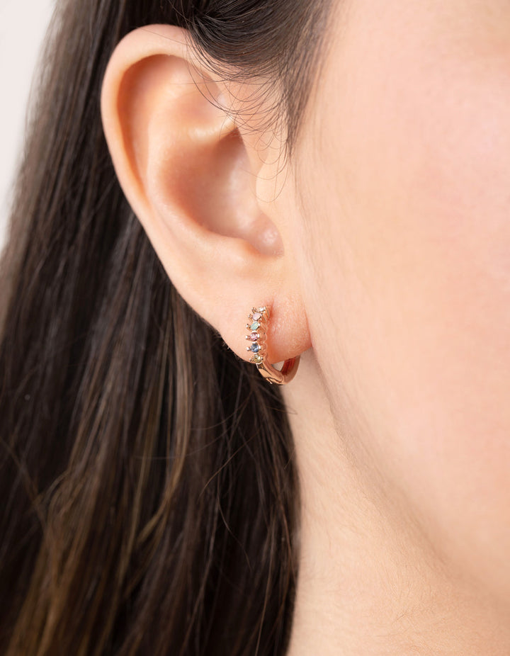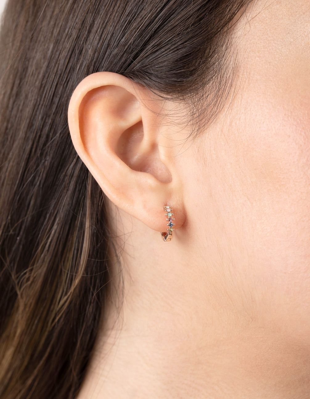 These Rainbow Diamante Huggies by Lovisa are perfect for adding a pop of color to your jewelry collection. The rainbow diamantes are set in a rose gold-toned hoop design, offering a vibrant and stylish look. Ideal for those with multiple piercings, these huggies can be stacked or worn alone for a statement piece.