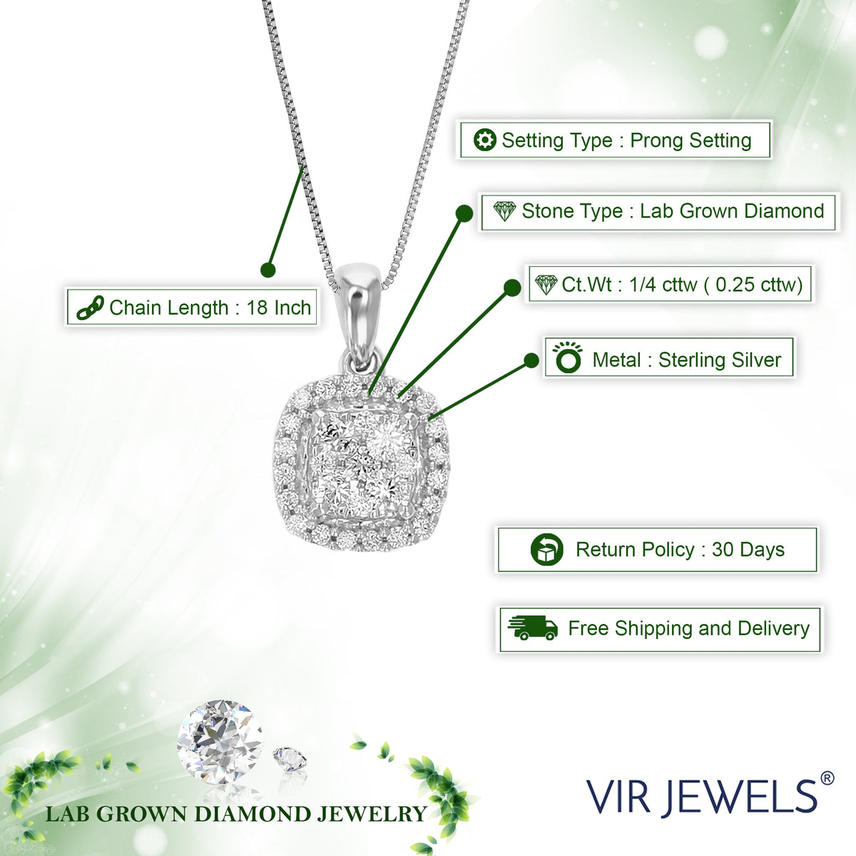 1/4 cttw Lab Grown Diamond Cushion Cluster Pendant Necklace .925 Sterling Silver 1/2 Inch with 18 Inch Chain
