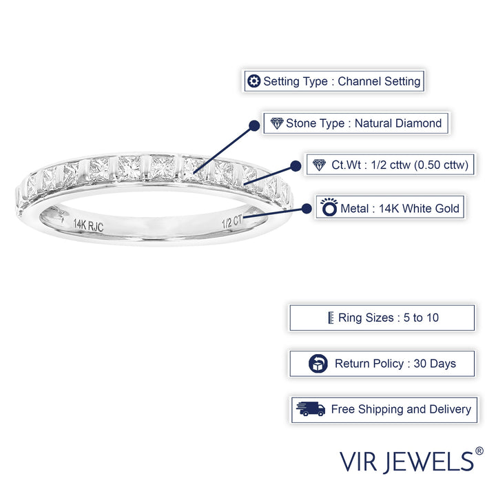14K white gold with 13 princess-cut diamonds, totaling 1/2 cttw. Diamond clarity: I1-I2, color: I-J. Band width: 3mm. Ring weight: 1.70 grams. Available in multiple sizes.