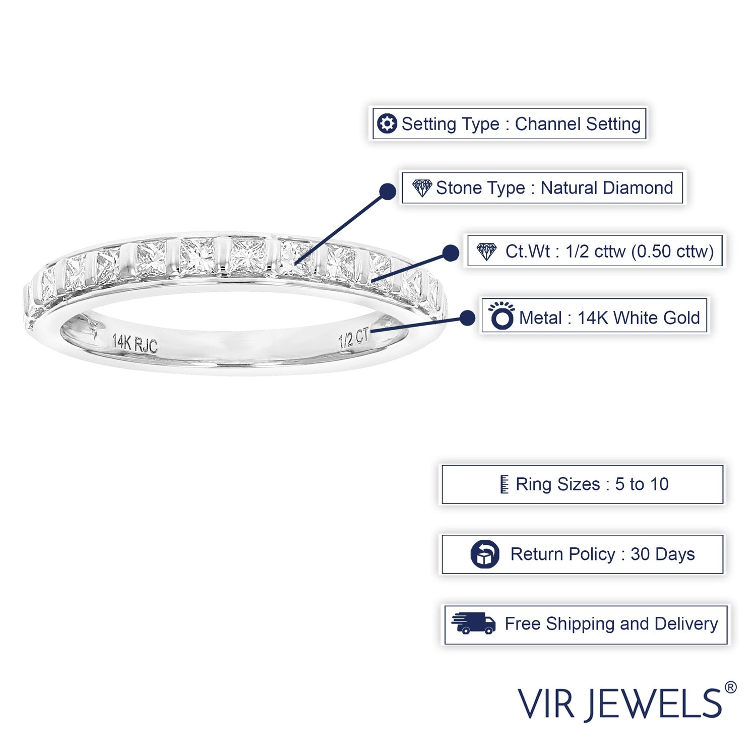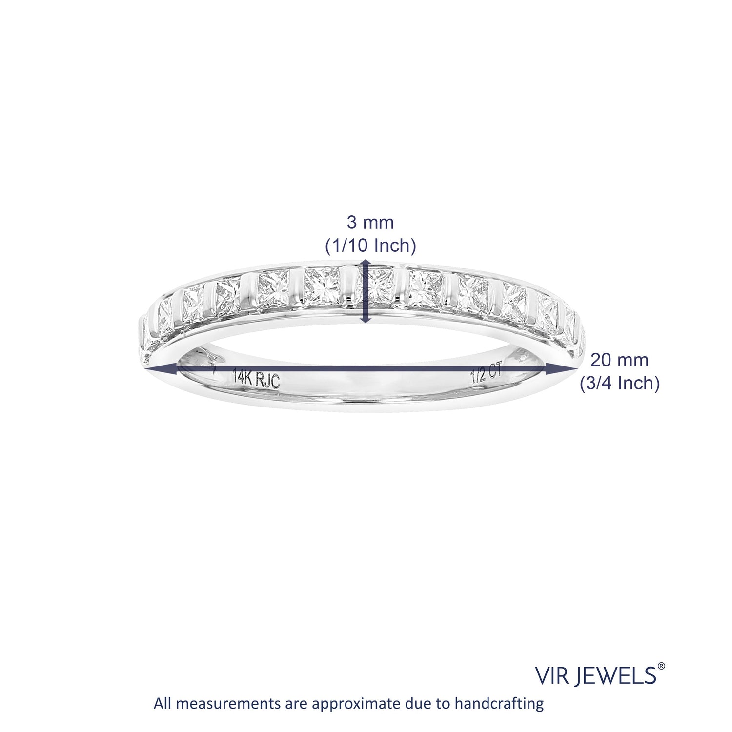 This 1/2 cttw Princess Cut Diamond Wedding Band by Vir Jewels is the epitome of elegance. Crafted in 14K white gold, this band features 13 princess-cut diamonds set in a channel setting, creating a seamless flow of sparkle. The 3mm band width ensures comfort while maintaining a refined and sophisticated look. Perfect for a wedding or anniversary, this piece symbolizes timeless love and commitment.