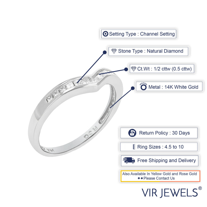 The 1/2 cttw Princess Diamond V Shape Wedding Band by Vir Jewels is a stunning, elegant choice for your special day. Featuring 1/2 ct. t.w. of princess-cut diamonds set in a sleek channel design, this 14K white gold band brings sophistication and brilliance to your wedding ensemble. The V-shape design adds a modern twist to a classic look, making it a perfect complement to any engagement ring. Ideal for couples seeking both beauty and durability in a wedding band.