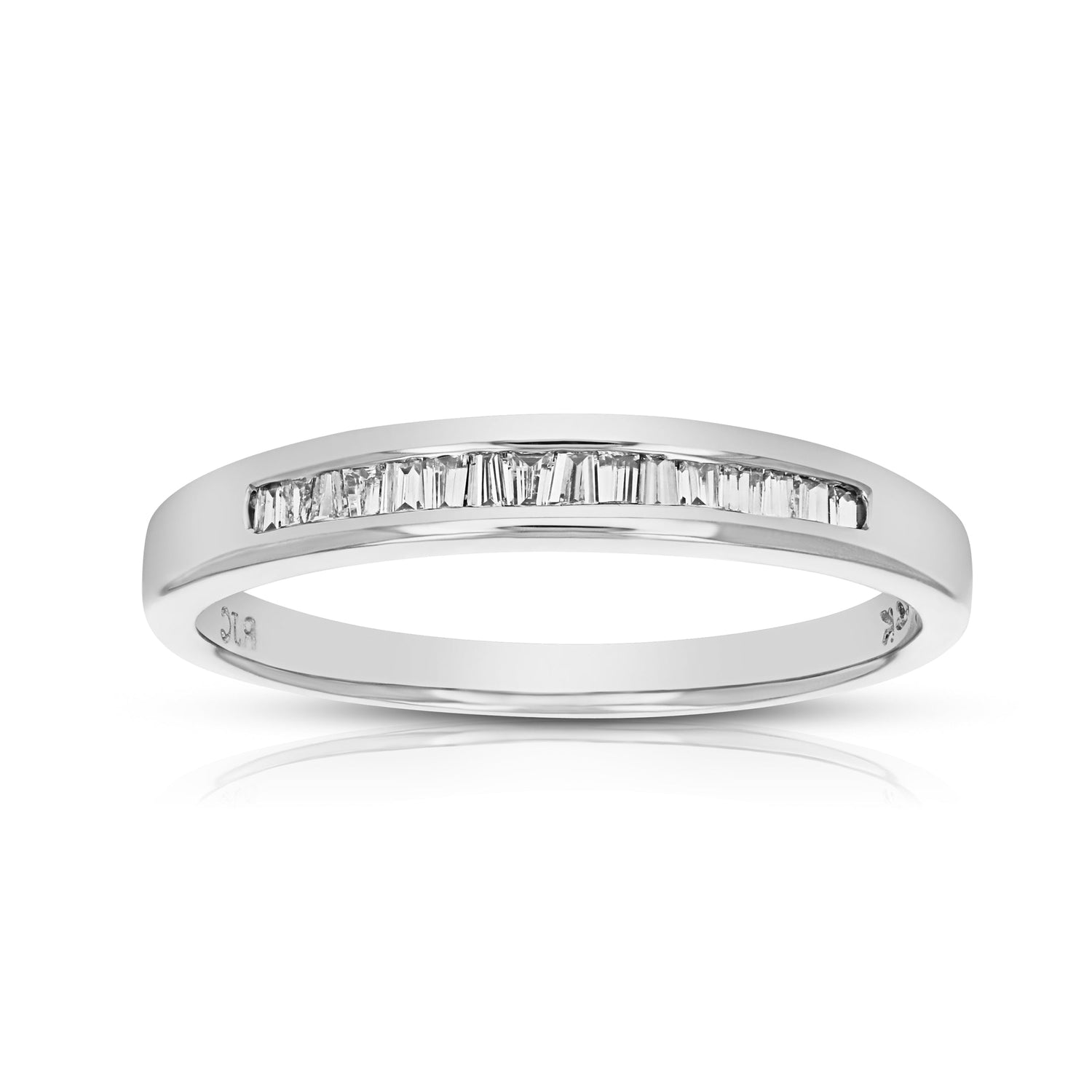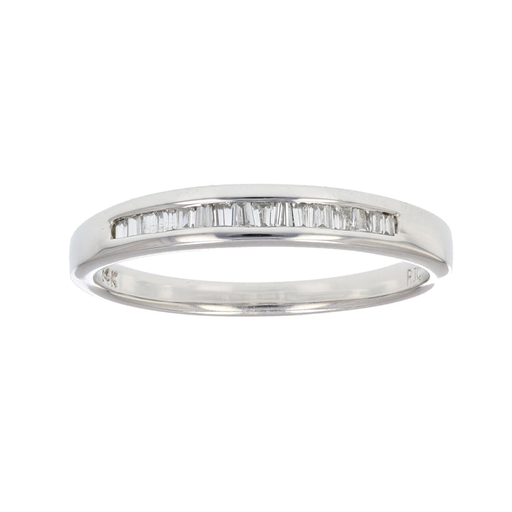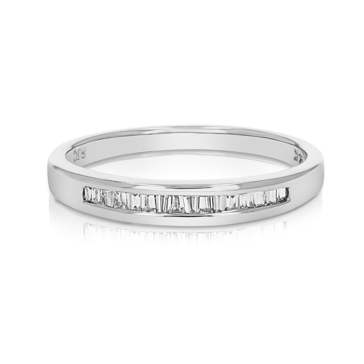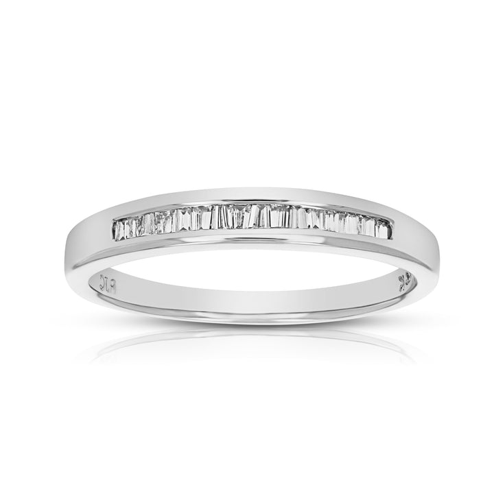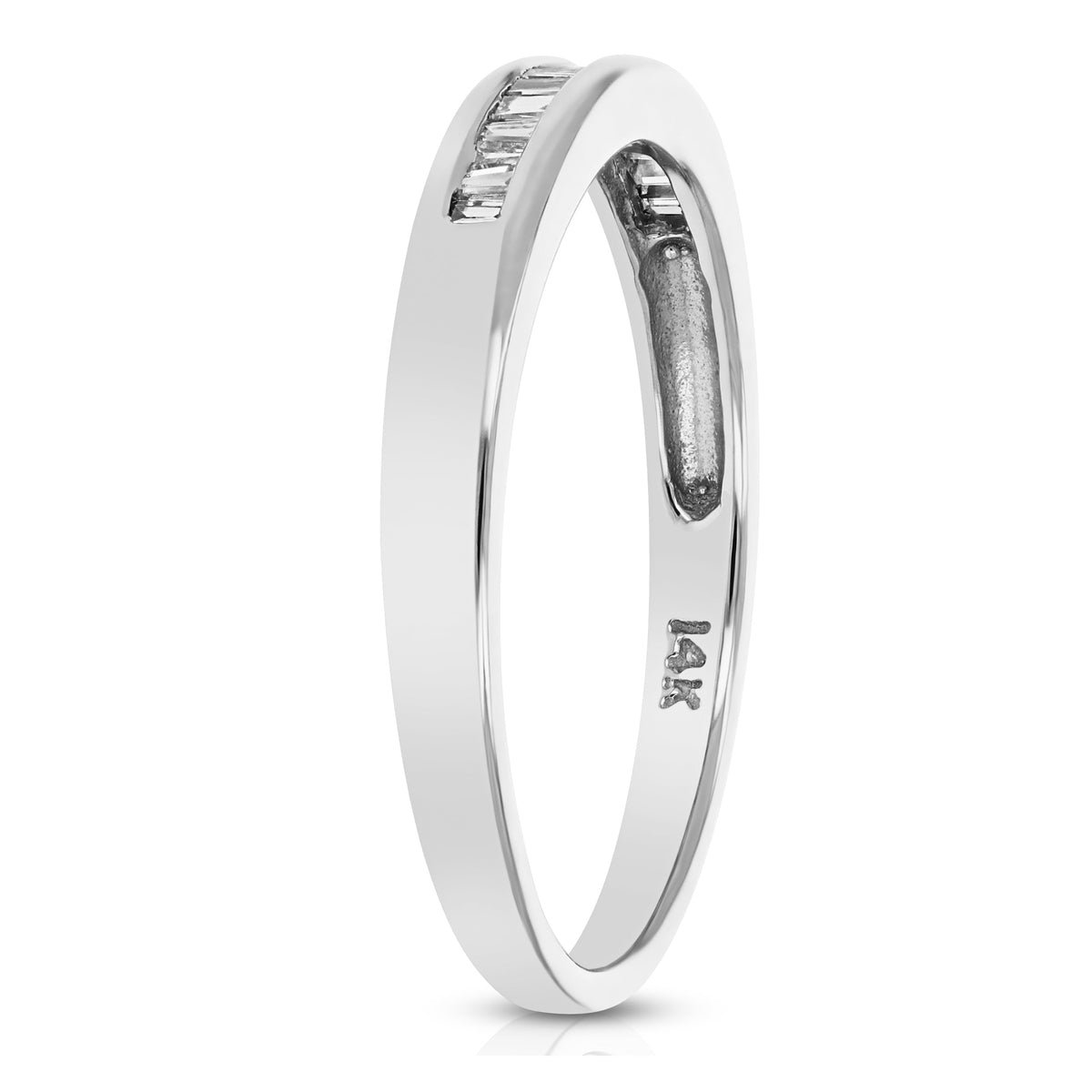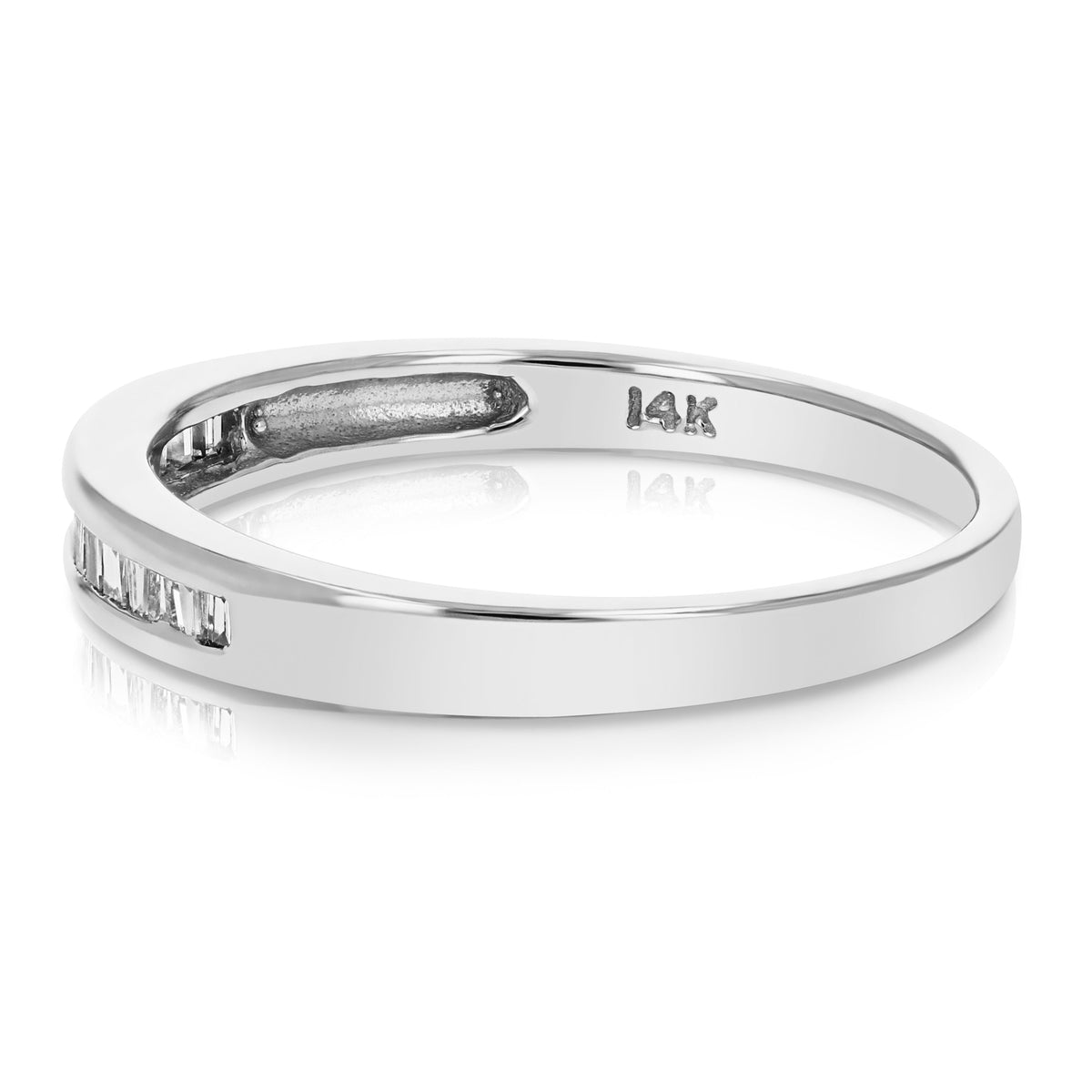 Crafted in 14K white gold with 1/4 cttw baguette-cut natural diamonds. Diamonds are I-J color, I1-I2 clarity, arranged in a channel setting. Band designed for daily wear with a smooth, polished finish.