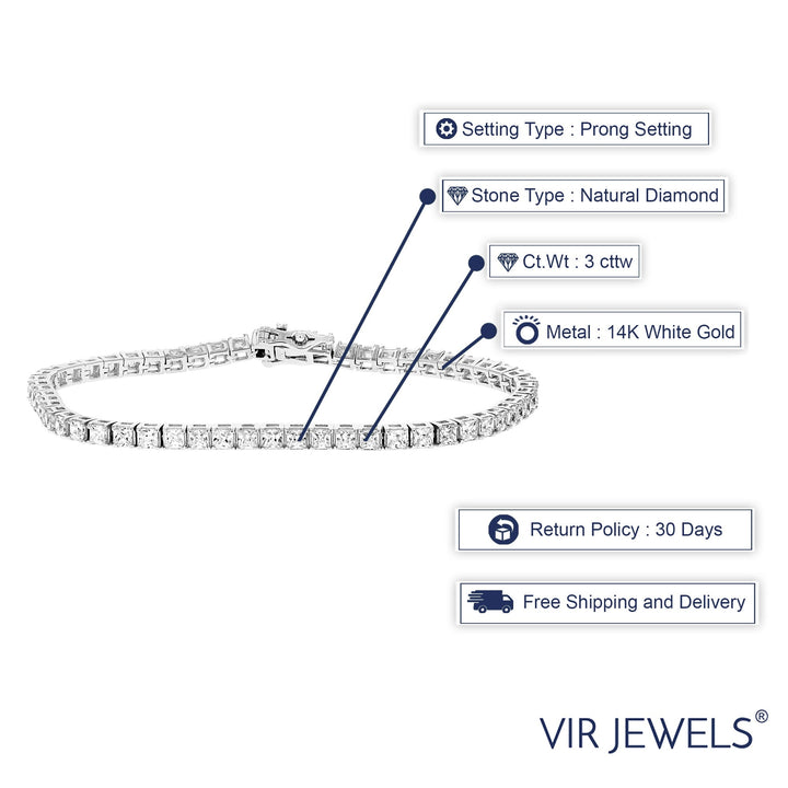 These 3 cttw Princess Diamond Tennis Bracelets in 14K White Gold by Vir Jewels are the epitome of elegance and timeless luxury. The bracelet features 72 sparkling princess-cut diamonds with SI2-I1 clarity and H-I color, set in a secure four-prong setting. The design exudes a classic charm with its pristine white gold, offering a sophisticated statement for any occasion. This bracelet is an ideal piece for those who appreciate both tradition and modernity, securing with a box and tongue safety clasp for comfort and reliability.