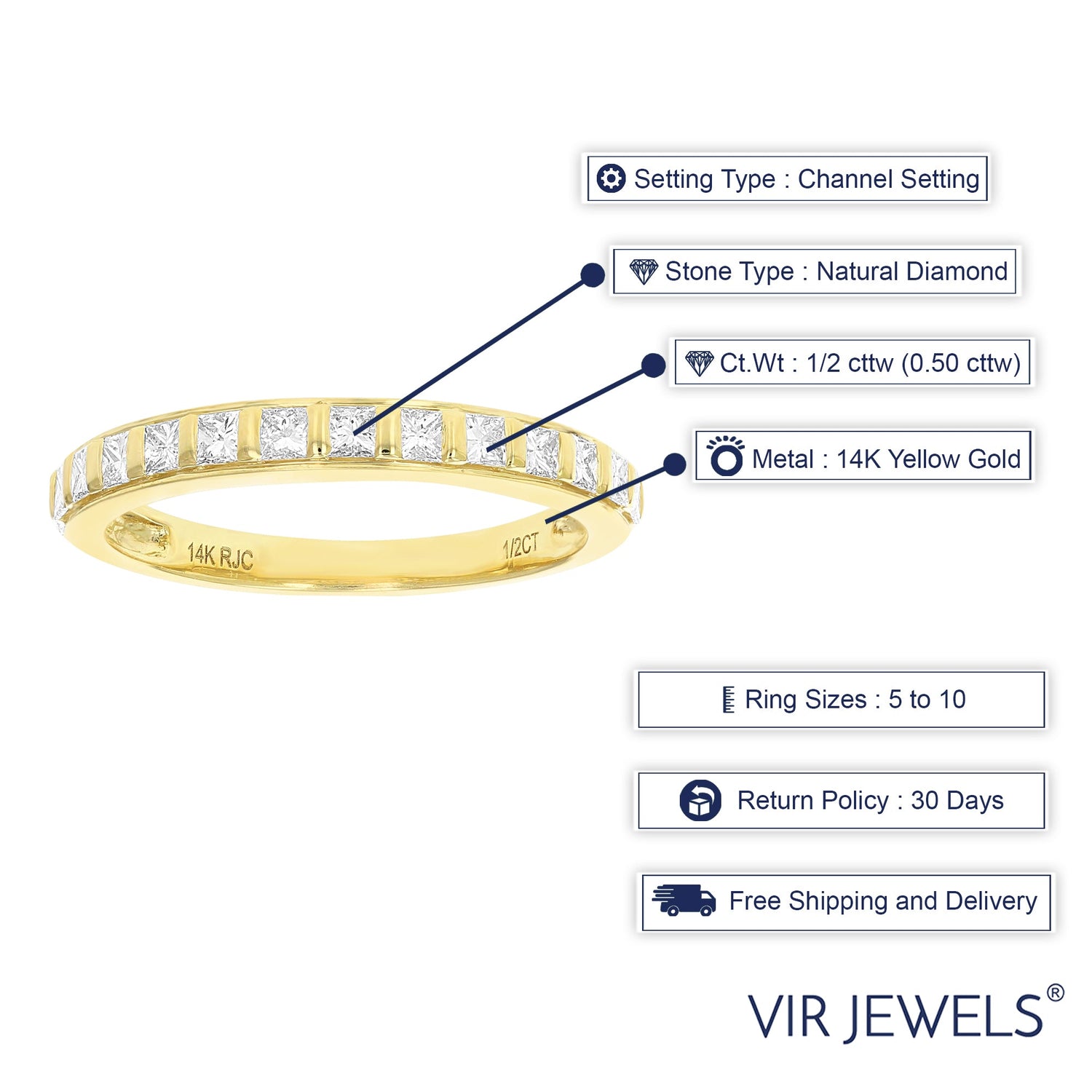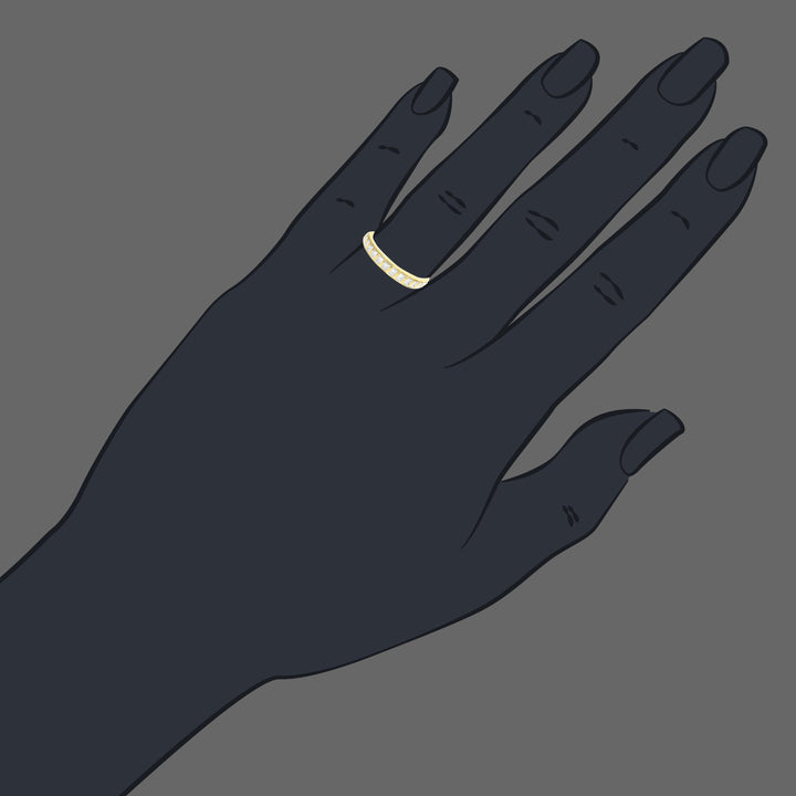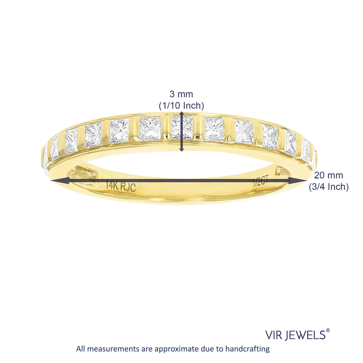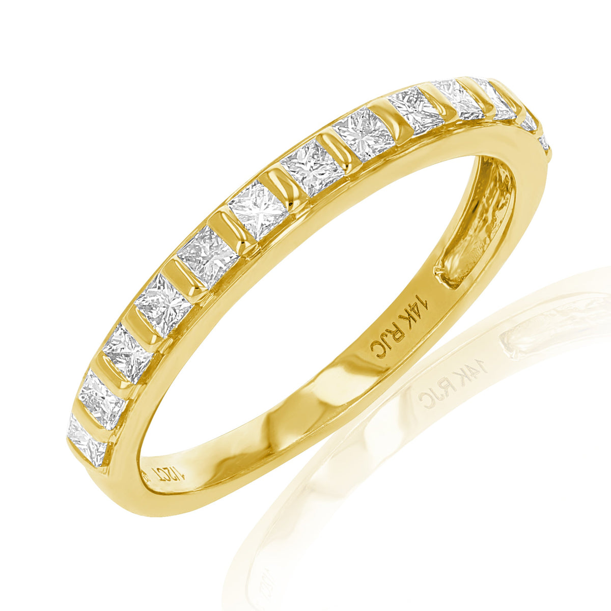Crafted in 14K yellow gold, this band features 13 princess-cut diamonds, totaling 1/2 cttw. Diamond color: I-J, clarity: I1-I2. Band width: 3mm. Channel setting. Total metal weight: 1.70 grams.