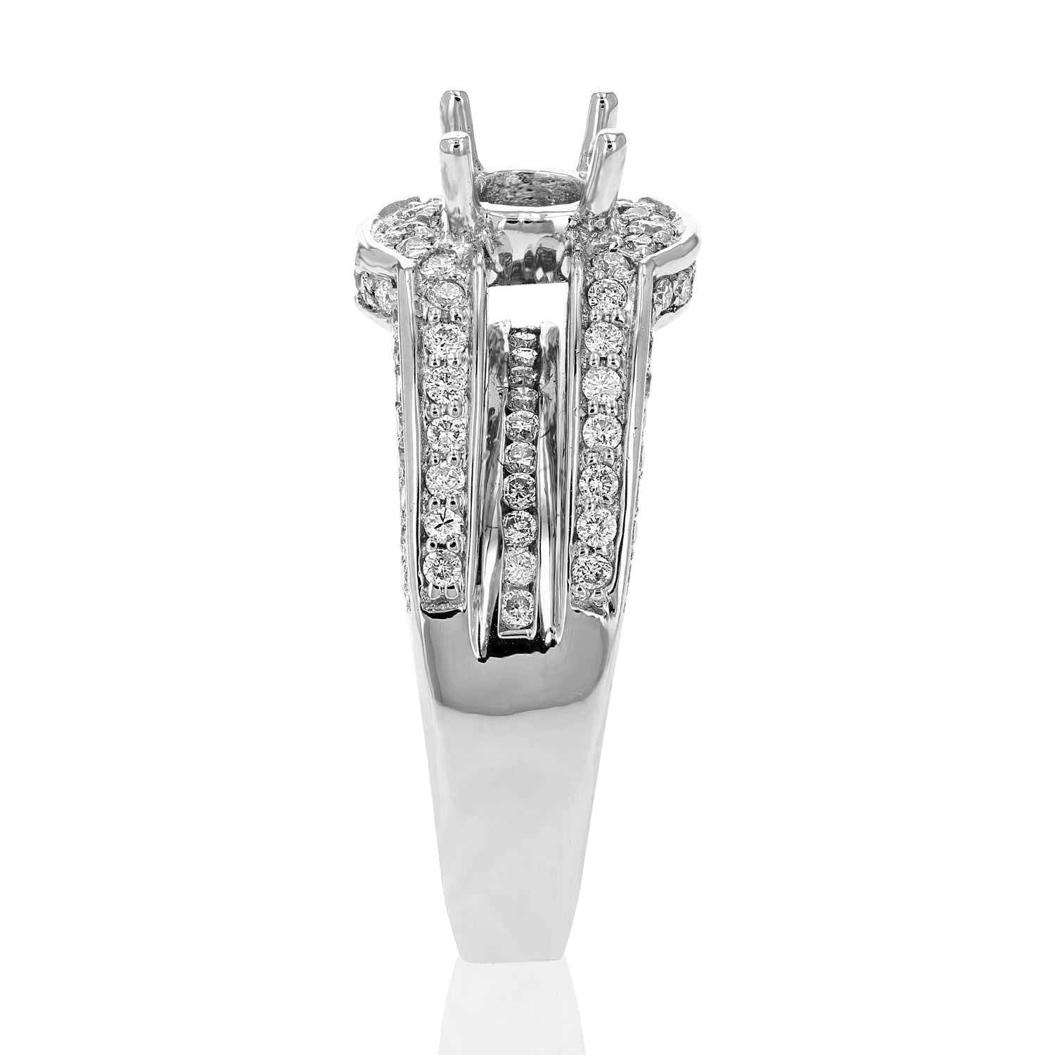 Crafted in 14K white gold, this engagement ring features 100 natural diamonds, totaling 1.10 cttw, with a clarity of I1-I2 and color I-J. The center stone can accommodate a 0.90 cttw round diamond (sold separately).