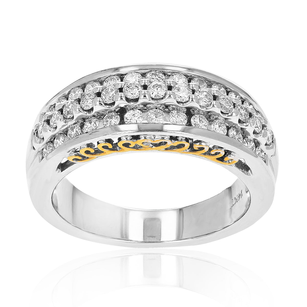 Crafted in 14k white gold, featuring 3/4 cttw round diamonds. Diamond color: I-J, clarity: I1-I2. Band width: 7mm.