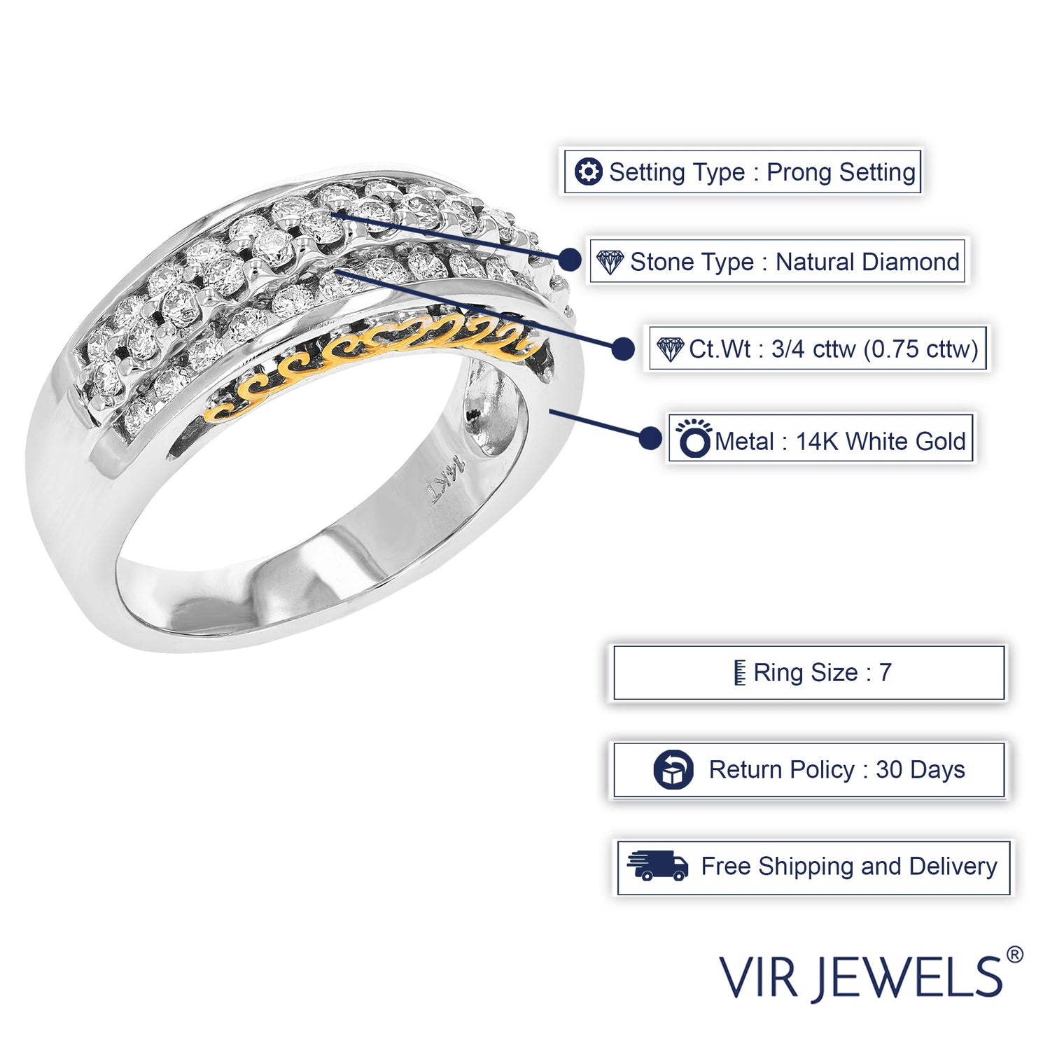 This 3/4 cttw Diamond Wedding Band by Vir Jewels is a breathtaking symbol of everlasting love. Featuring 39 round diamonds set in a triple-row prong design, this elegant band radiates brilliance. Crafted in 14k white gold, it offers a luxurious and timeless appeal, making it the perfect choice for a wedding or anniversary band.
