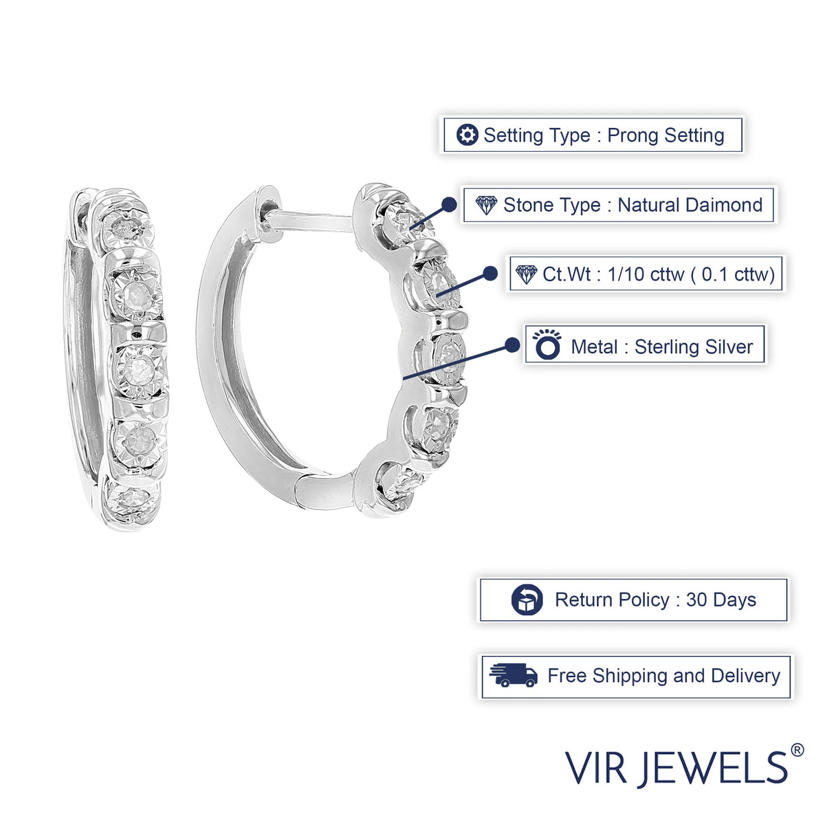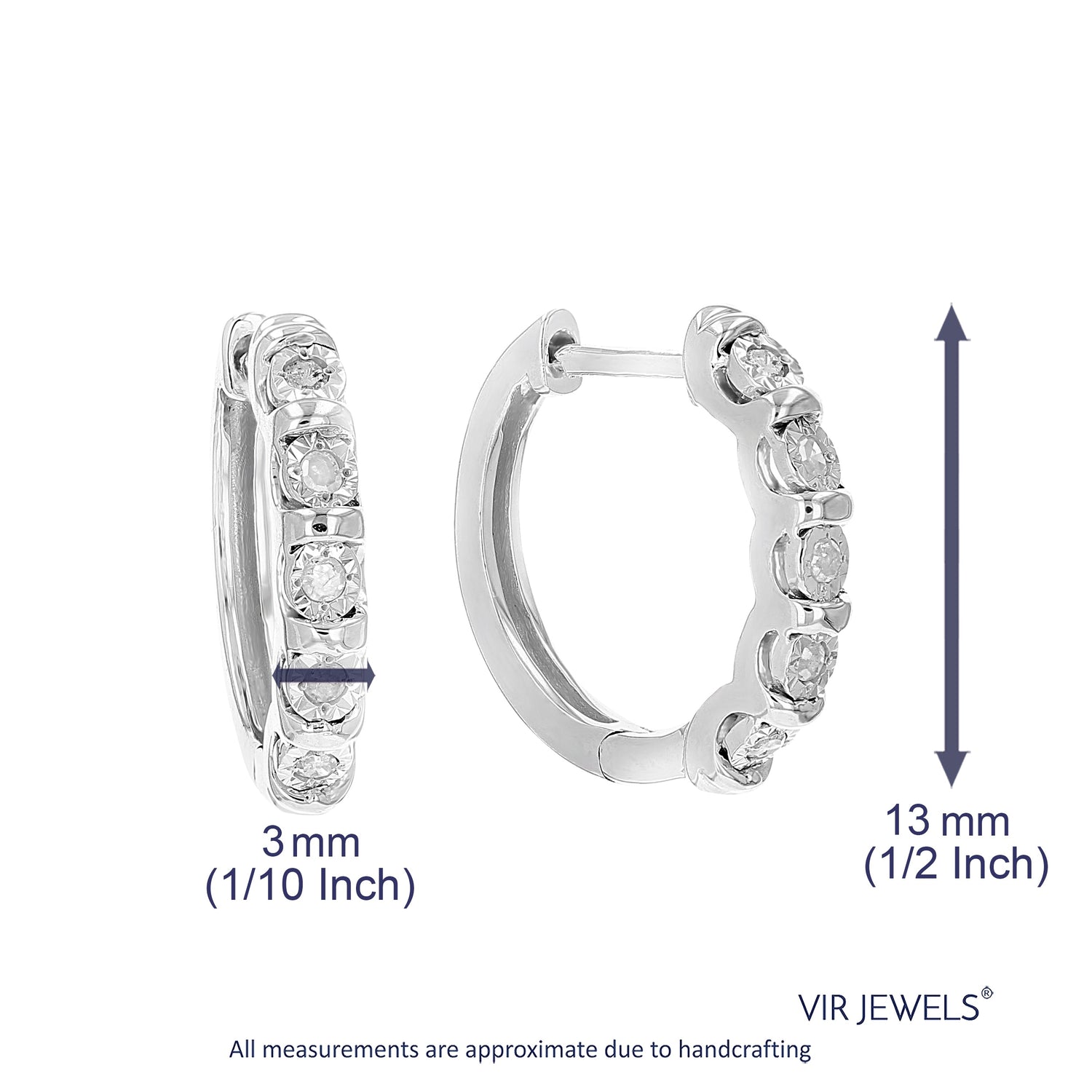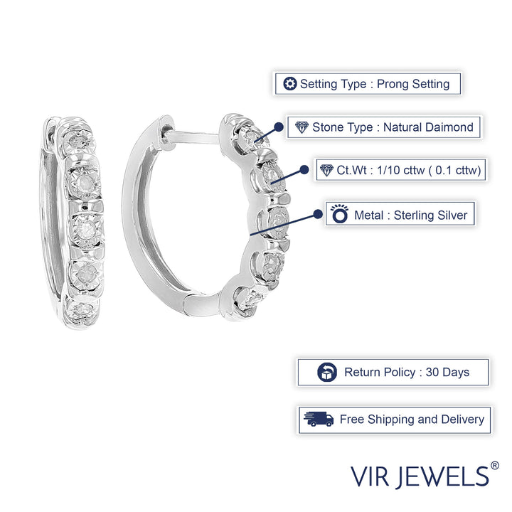 These 1/10 cttw Diamond Hoop Earrings by Vir Jewels are a delicate and classic addition to any jewelry collection. Featuring ten round-cut diamonds set in sterling silver, these hoops have a subtle sparkle that enhances both casual and formal looks. Their elegant design and secure hinge closure make them ideal for everyday wear.