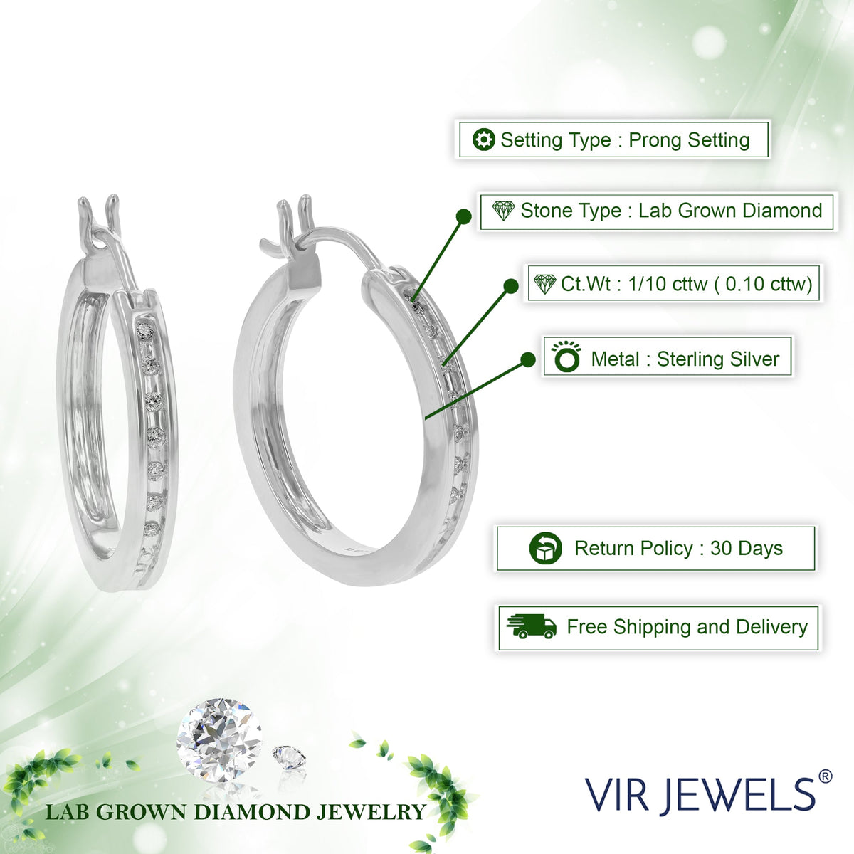 These 1/10 cttw round lab-grown diamond hoop earrings by Vir Jewels combine classic design with modern sustainability. Featuring 14 diamonds set in a prong setting, these earrings offer a brilliant sparkle, perfect for elevating any outfit. Lab-grown diamonds provide the same beauty and durability as natural diamonds, with the added benefit of being environmentally responsible. The sterling silver design ensures long-lasting shine and durability, making these earrings an elegant addition to any jewelry collection.