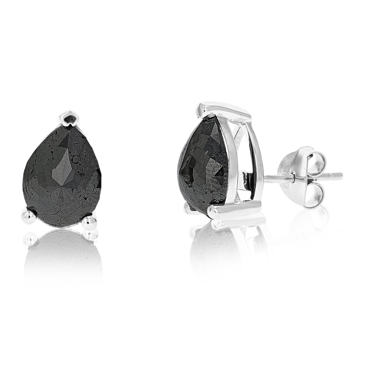 Crafted from .925 sterling silver, featuring 4.50 cttw natural pear-shaped black diamonds with I1-I2 clarity. The earrings are set with 12 diamonds and secured with push back closures.