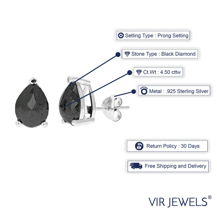 4.50 cttw Pear Shape Black Diamond Stud Earrings .925 Sterling Silver Prong Set