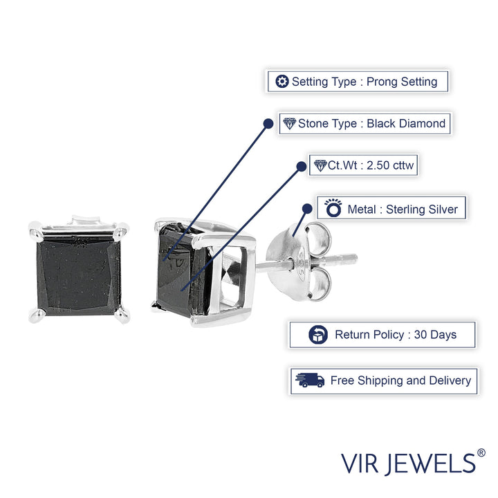 2.50 cttw Princess Cut Black Diamond Stud Earrings .925 Sterling Silver