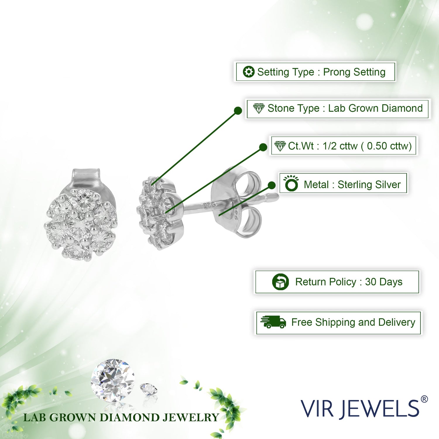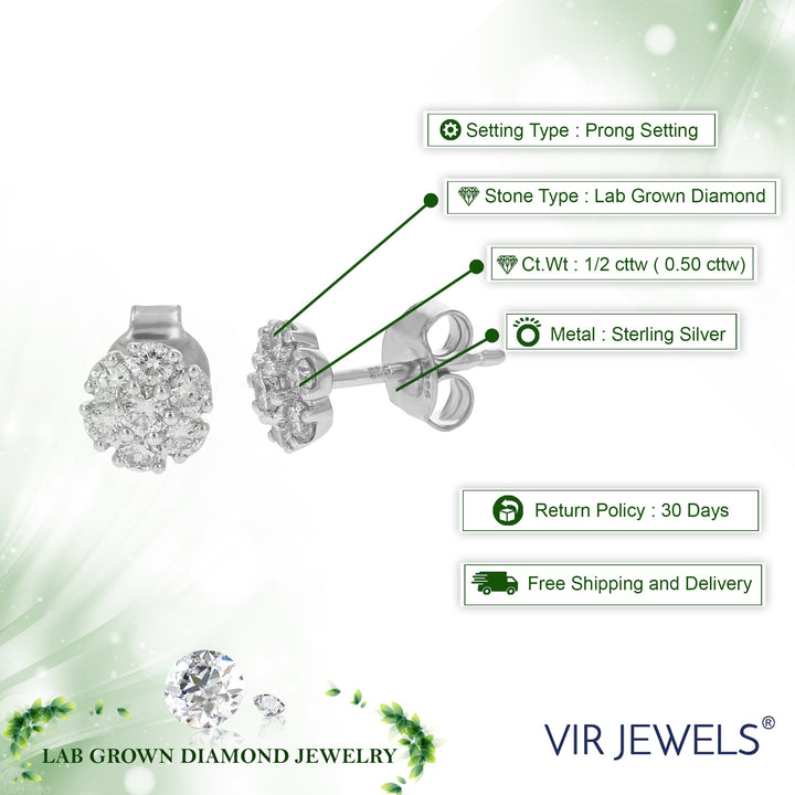Handcrafted in .925 sterling silver, featuring 1/2 cttw lab-grown diamonds (14 stones). Round-cut diamonds with H-I color and SI1-SI2 clarity. Prong setting. Stud dimensions: Width - 6mm (1/4 inch), Height - 6mm (1/4 inch).