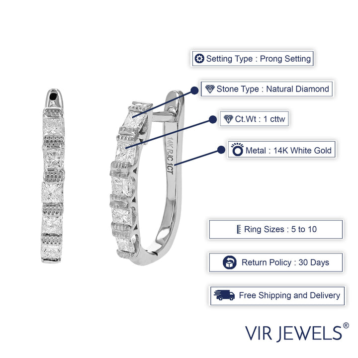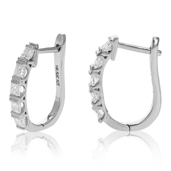 These 1 cttw Princess Diamond Hoop Earrings in 14K White Gold are designed for those who love classic sophistication with a modern edge. The earrings feature 10 round, prong-set princess cut diamonds, set in a channel design, and accented with milgrain details. Crafted in radiant 14K white gold, the hoop earrings are a versatile choice for both day and evening wear. Their elegant design is complemented by hinge backs for a comfortable, secure fit.