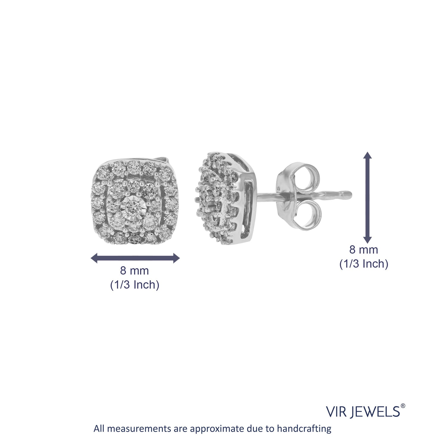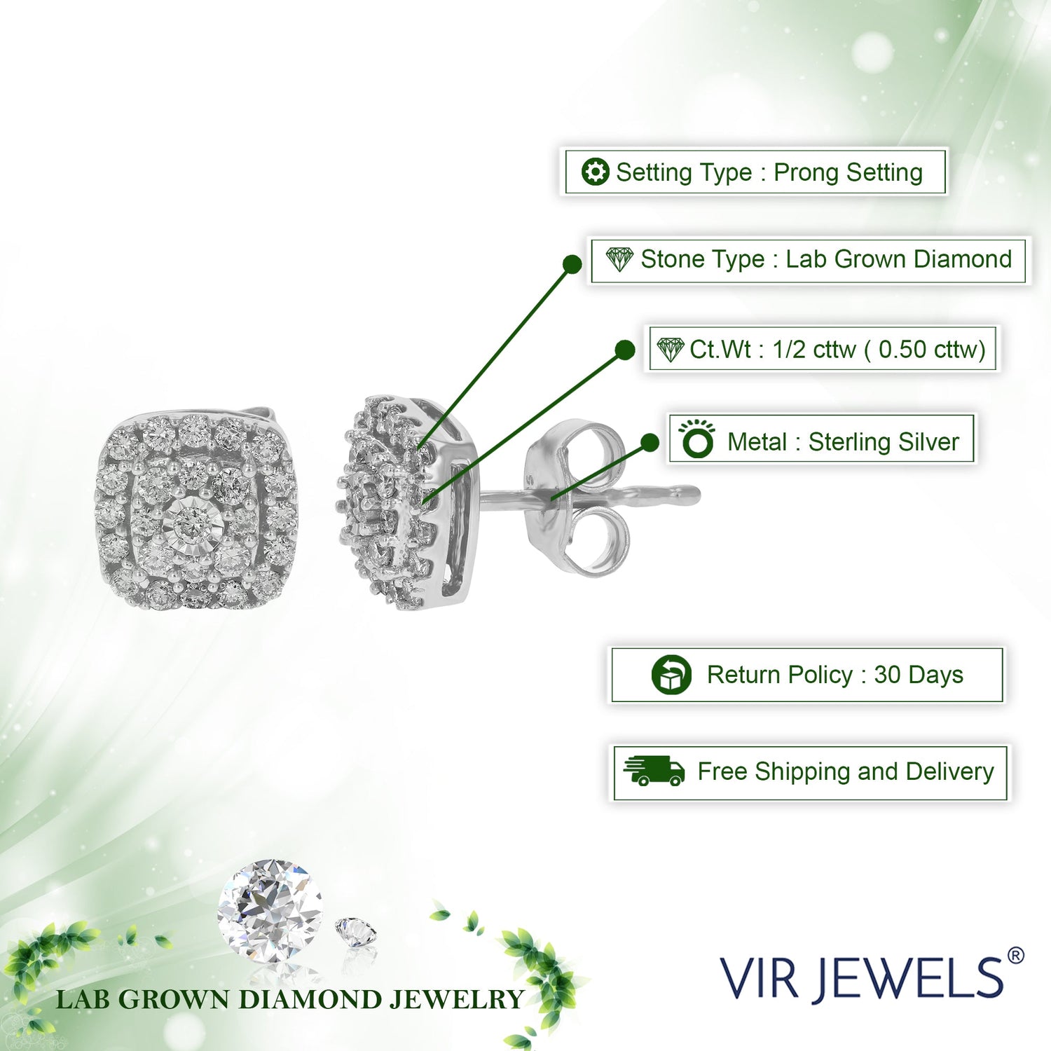 Handcrafted in .925 sterling silver, featuring 1/2 cttw lab-grown diamonds (50 stones). Round-cut diamonds with H-I color and SI1-SI2 clarity. Prong setting. Stud dimensions: Width - 8mm (1/3 inch), Height - 8mm (1/3 inch).