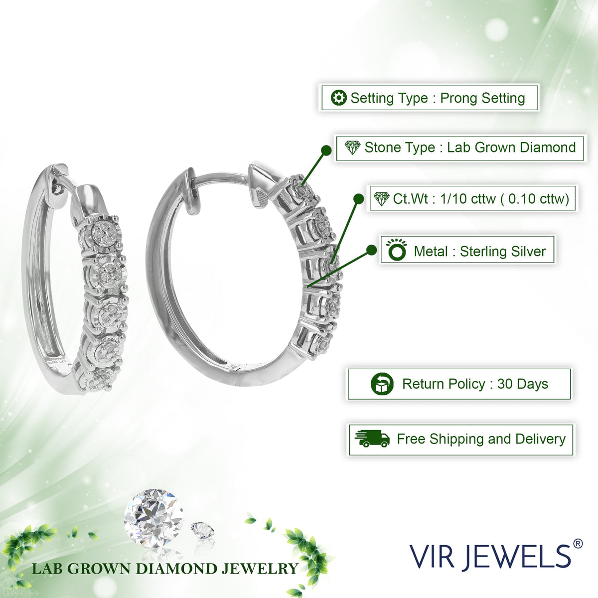 These 1/10 cttw Round Lab Grown Diamond Prong Set Hoop Earrings by Vir Jewels combine delicate charm with lasting brilliance. Featuring 32 round lab-grown diamonds, these earrings shine with understated elegance. The prong setting ensures that the diamonds are securely held while enhancing their brilliance. Crafted in sterling silver, these earrings are durable and maintain their shine over time. Perfect for any outfit, these earrings offer both style and sustainability.