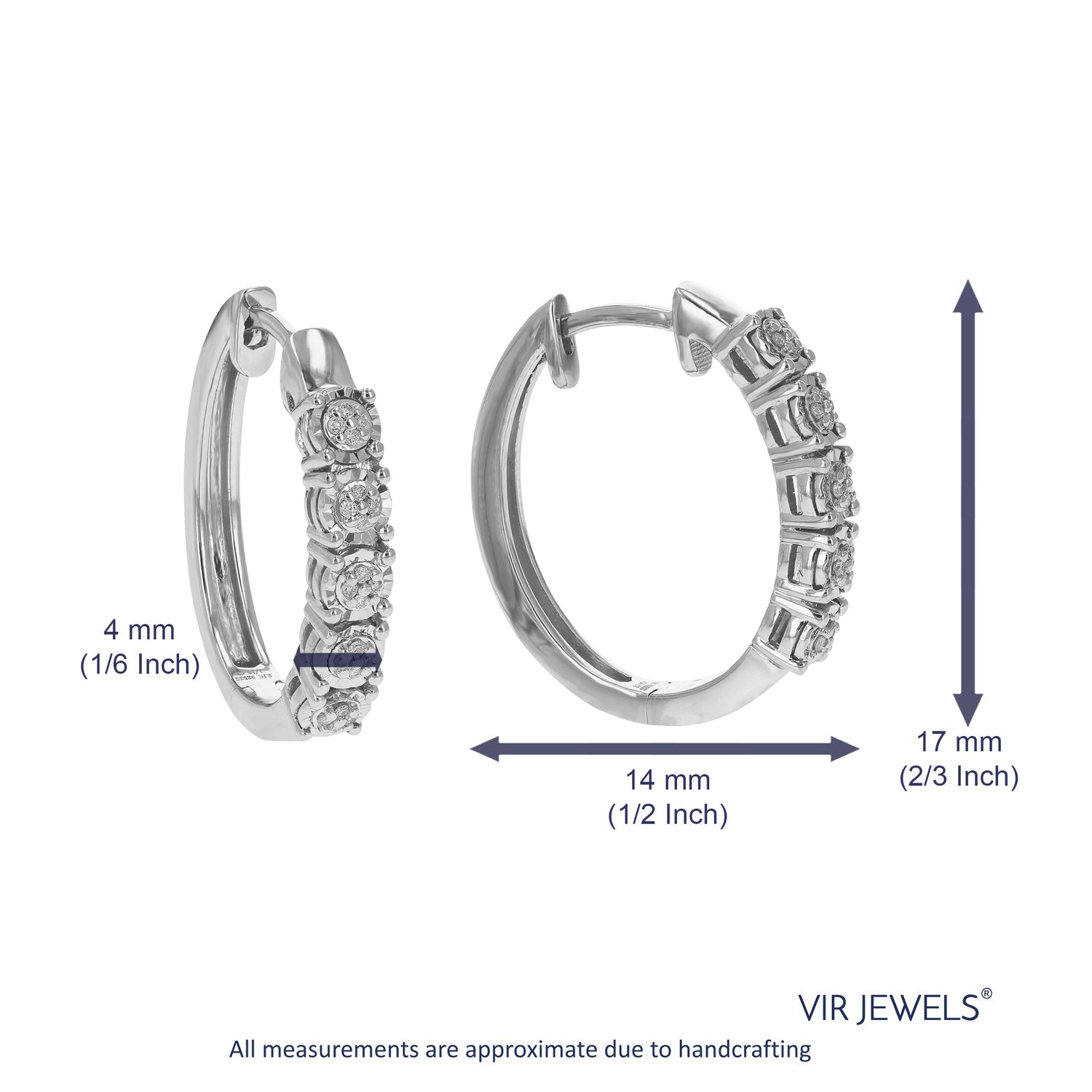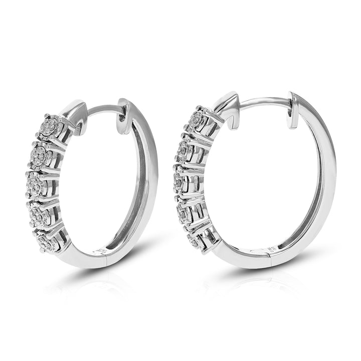 Handcrafted in .925 sterling silver, these hoop earrings feature 32 round lab-grown diamonds totaling 1/10 cttw. The diamonds are H-I in color and SI1-SI2 in clarity, securely set in prong settings. The earrings measure 17 mm (2/3 inch) in height and 4 mm (1/6 inch) in width, providing a sleek and elegant design. Ideal for adult women, these earrings combine sophistication with eco-friendly luxury.