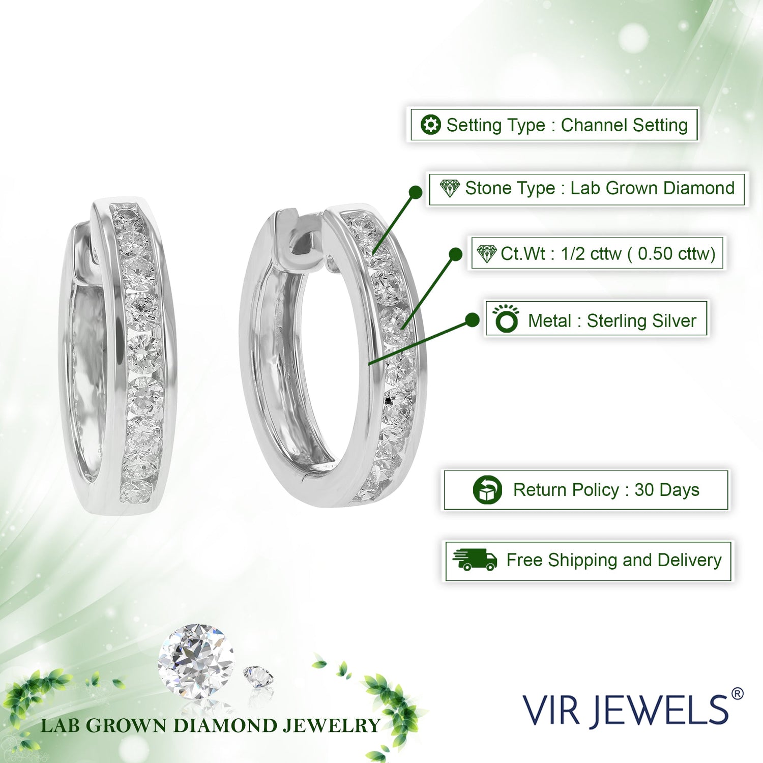 The 1/2 CT Round Cut Lab Grown Diamond Hoop Earrings in .925 Sterling Silver by Vir Jewels blend timeless elegance with modern sophistication. Featuring 18 brilliant round-cut lab-grown diamonds, these hoops are channel-set to create a seamless and polished look. The sleek sterling silver enhances the diamonds’ radiance, making these earrings an ideal choice for both everyday wear and special occasions. Designed for effortless styling, these versatile hoops add a touch of refined glamour to any outfit.